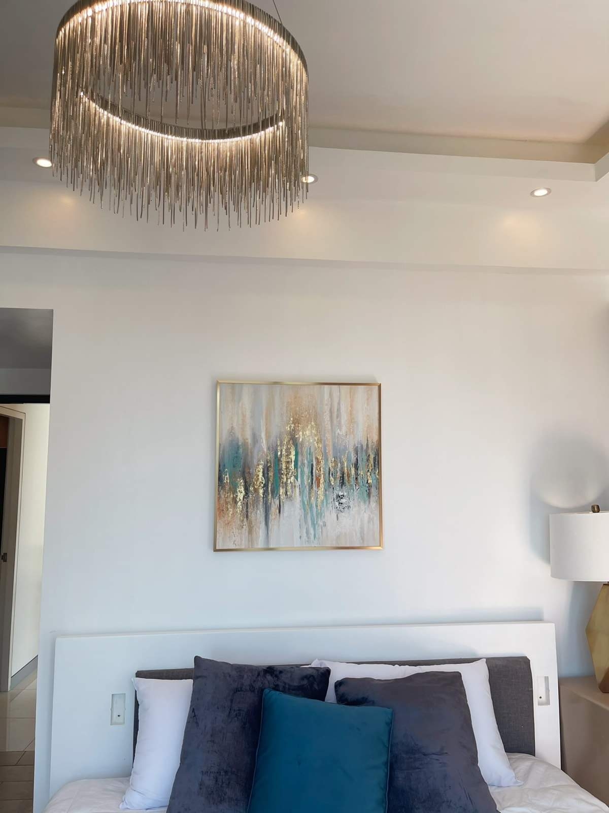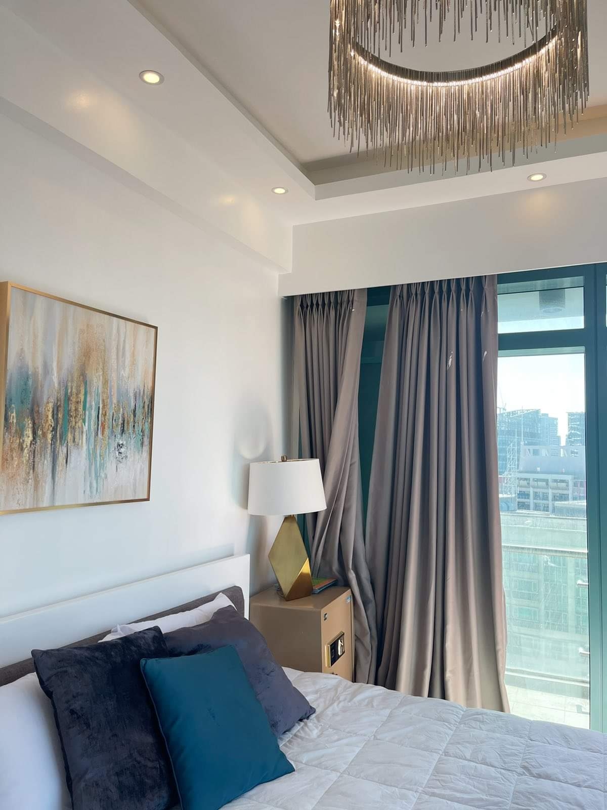 Master bedroom furnished with a queen size bed, fitted cabinet, bedside table with lamp on top, potted plant, artworks, has en-suite shower room and floor to ceiling windows that boasts an overlooking view of golf course