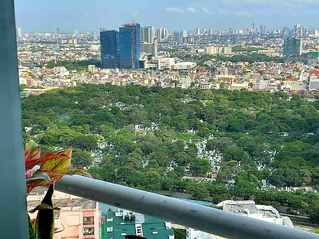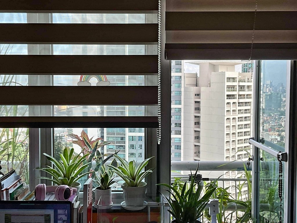 Living area has a sofa, console table, potted plants and has access to the balcony overlooking the views of Makati skyline