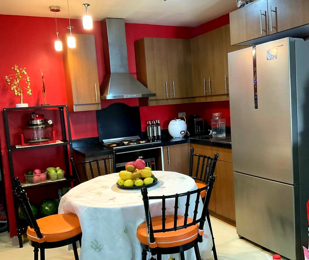 Open plan fitted kitchen is equippedwith major appliances with refrigerator, electric stove , rangehood, turbo broiler and rice cooker