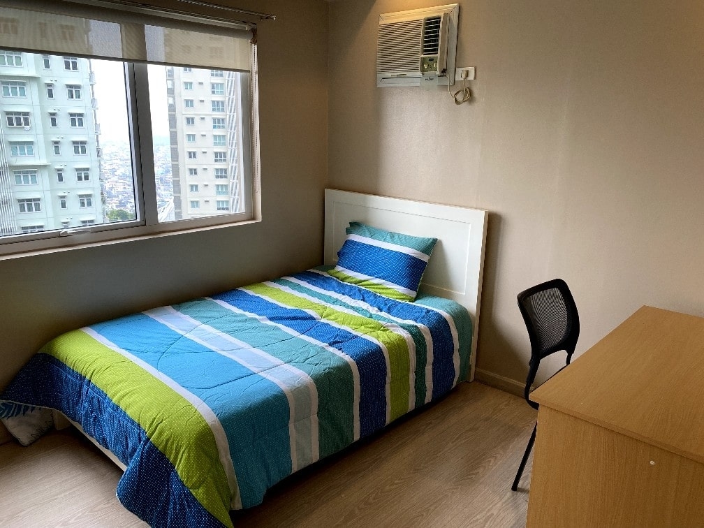 Second bedroom has a single bed, study table, chair, wall type air-conditioning and en-suite shower room as well