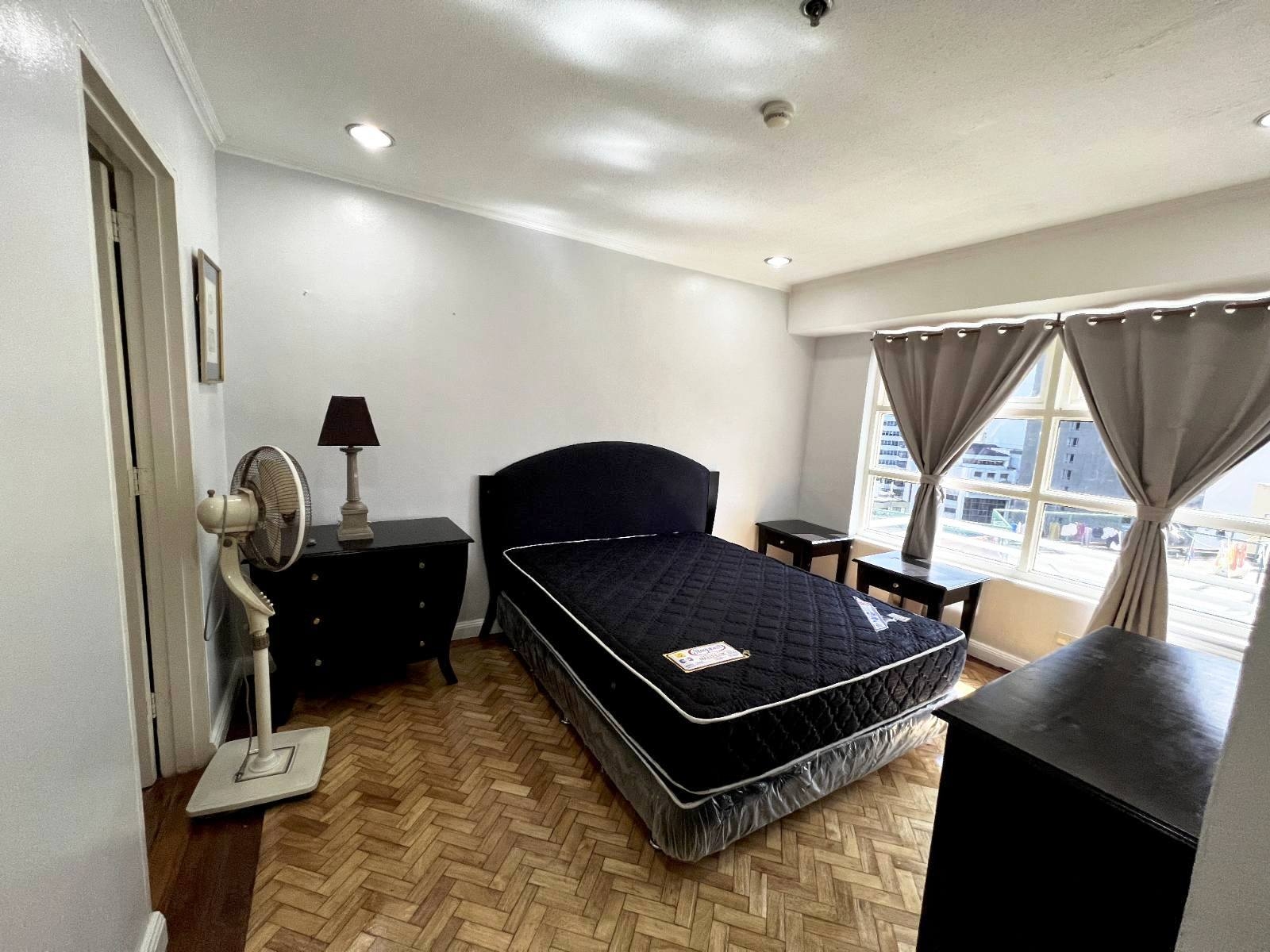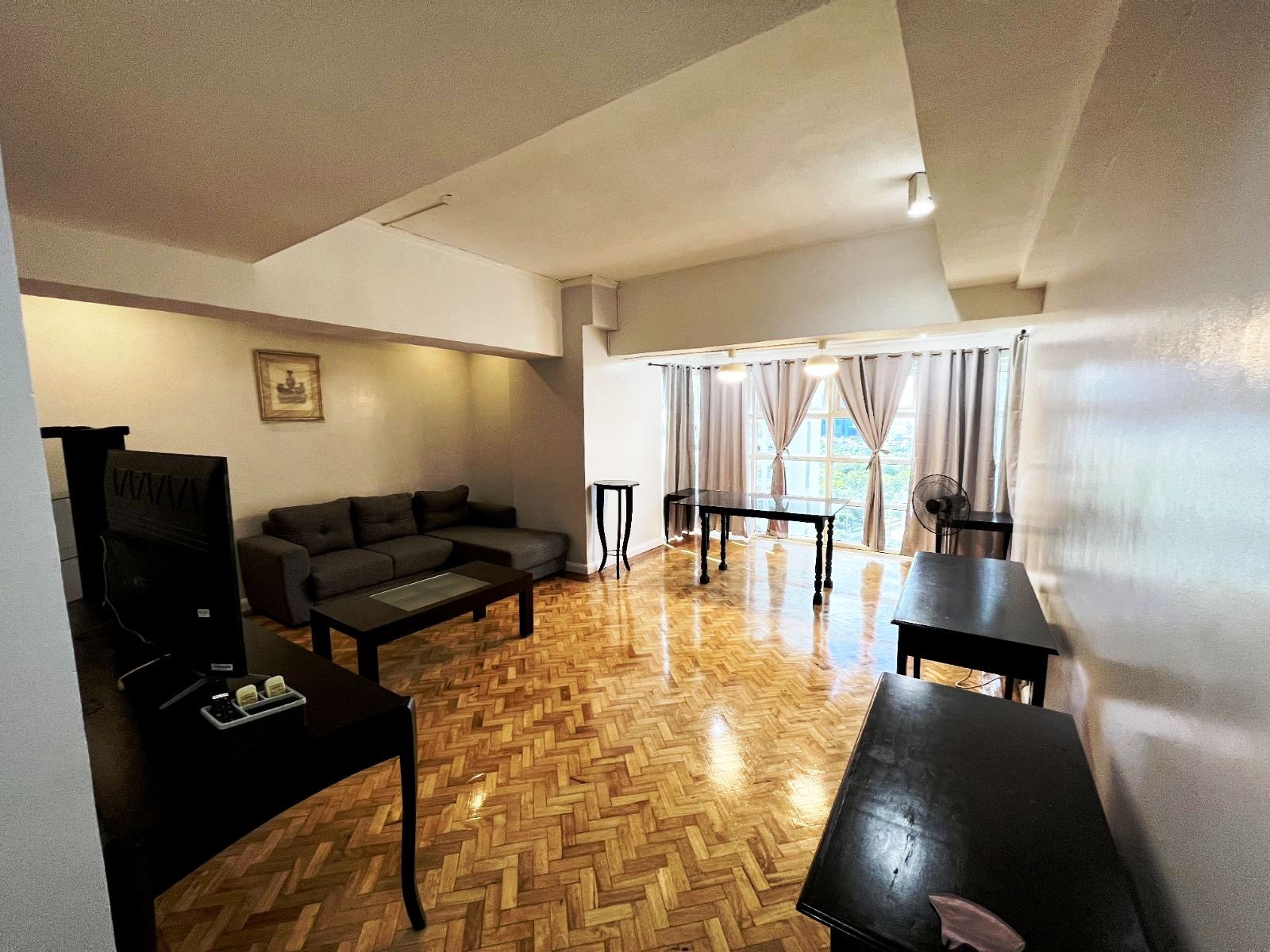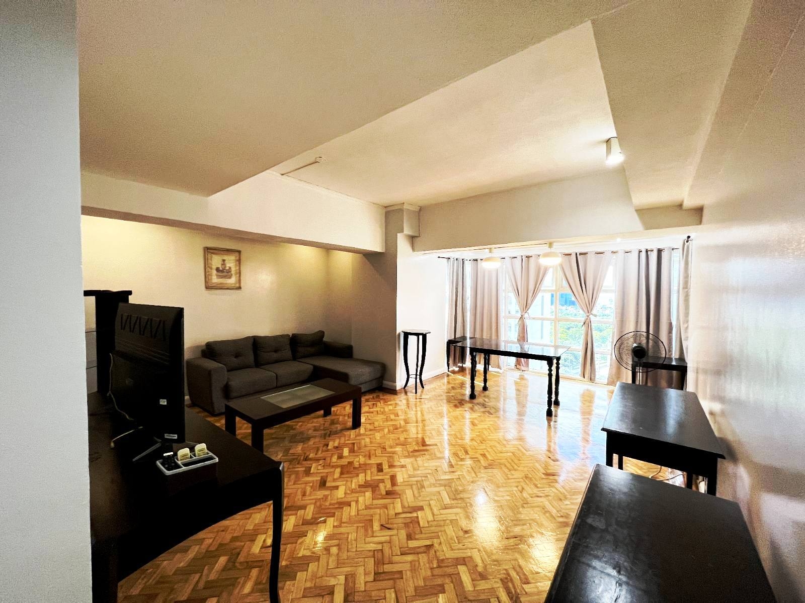 Spacious living room with views of Makati Sports Club comes furnished with an L-shaped sofa, side table,s flat screen TV, console tables and a stand fan