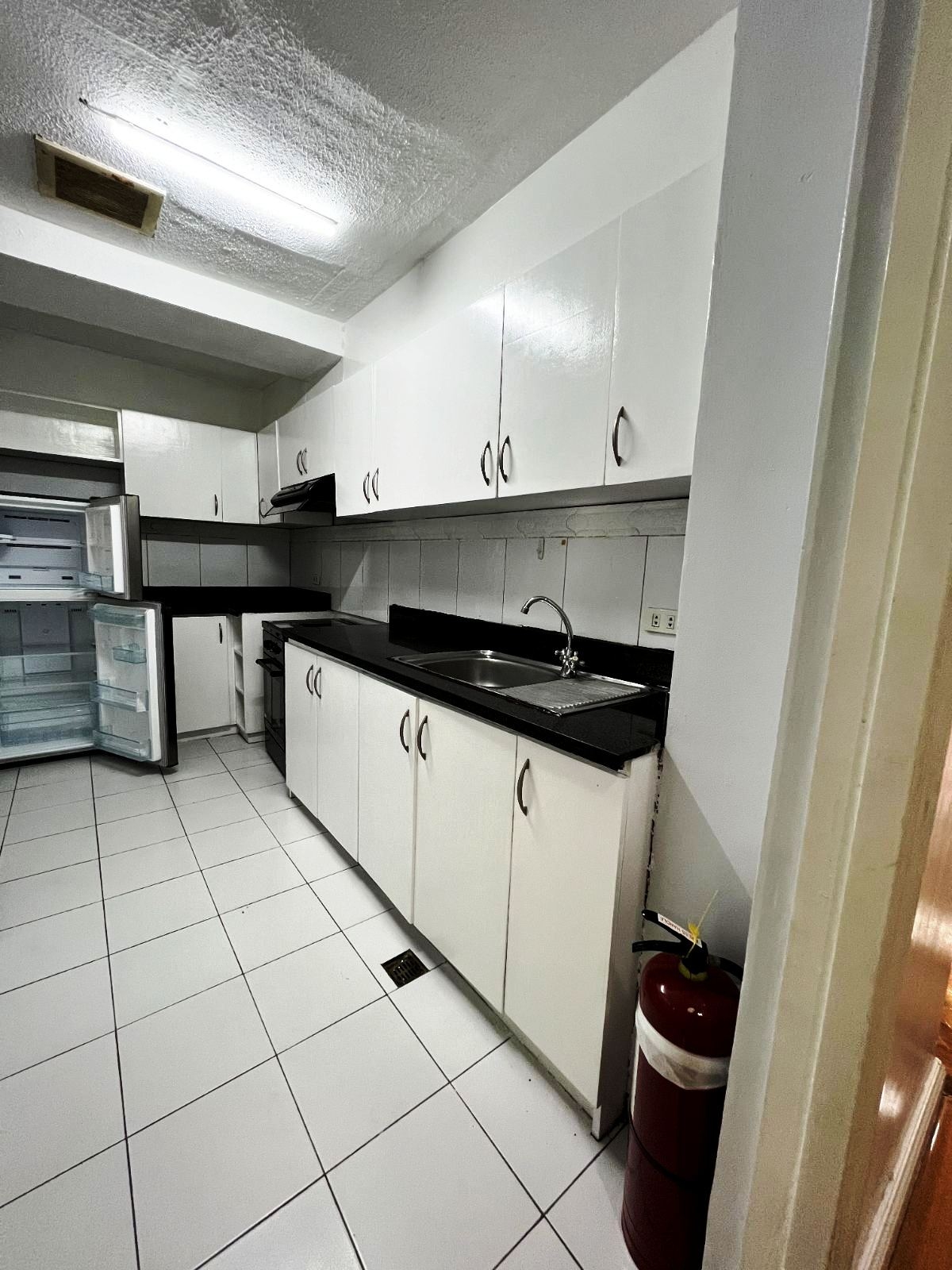Separate fitted kitchen with all major appliances including electric stove, range hood and refrigerator