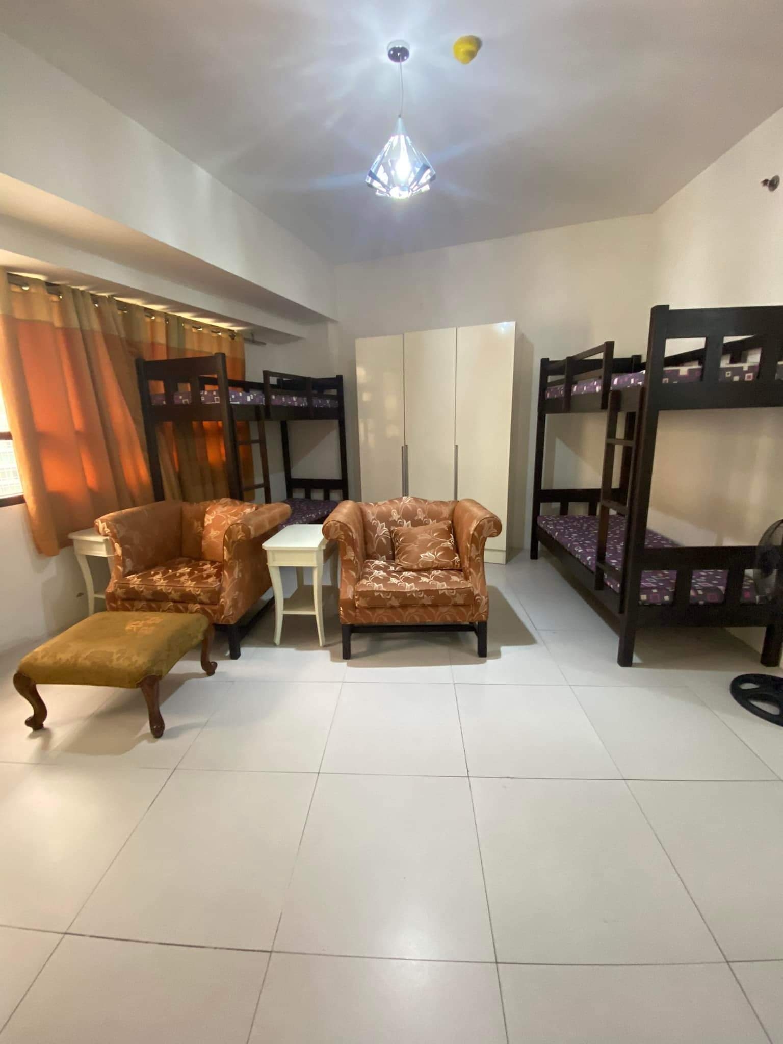 Adjacent sleeping area has a cabinet and two bunk beds