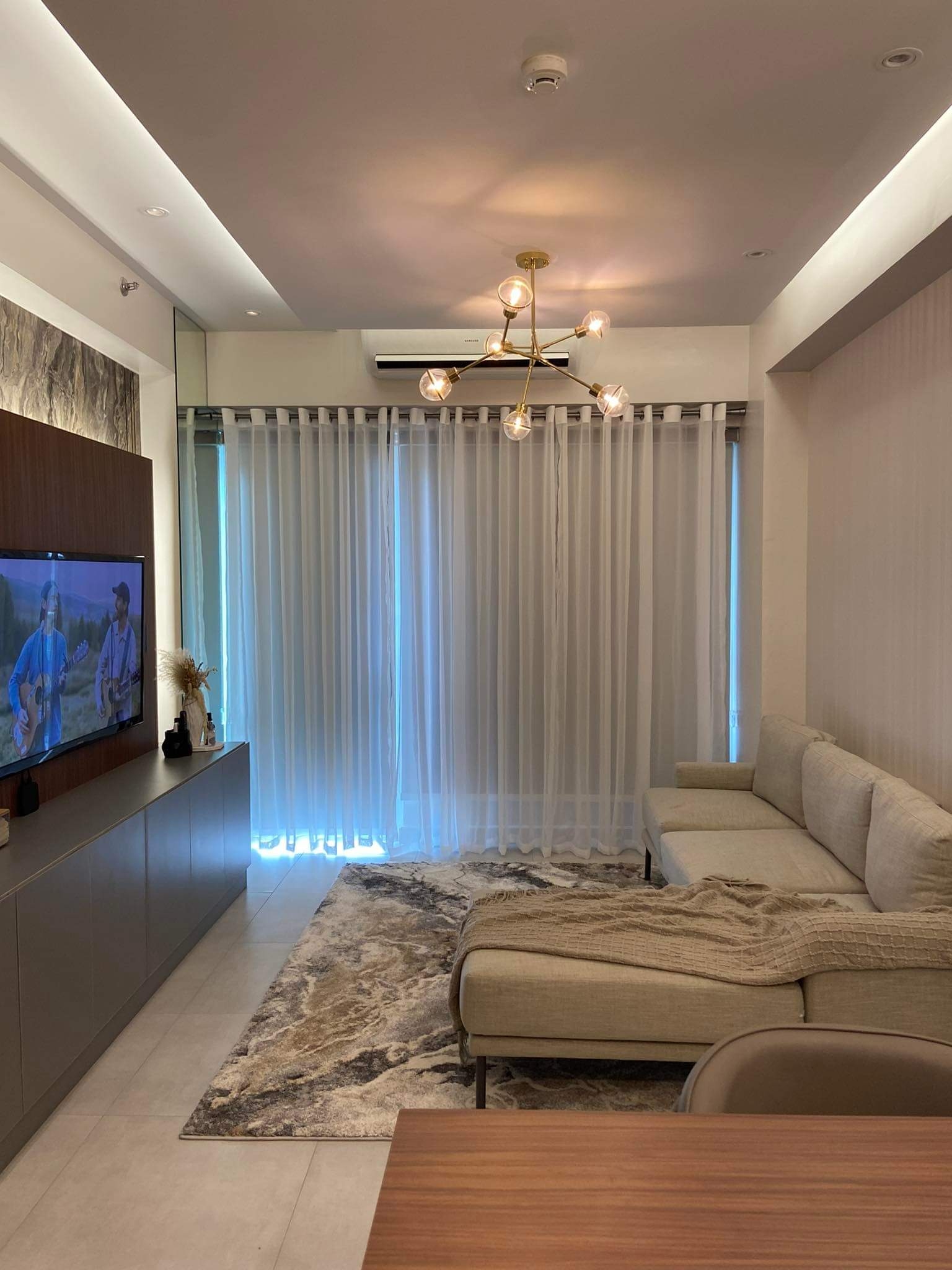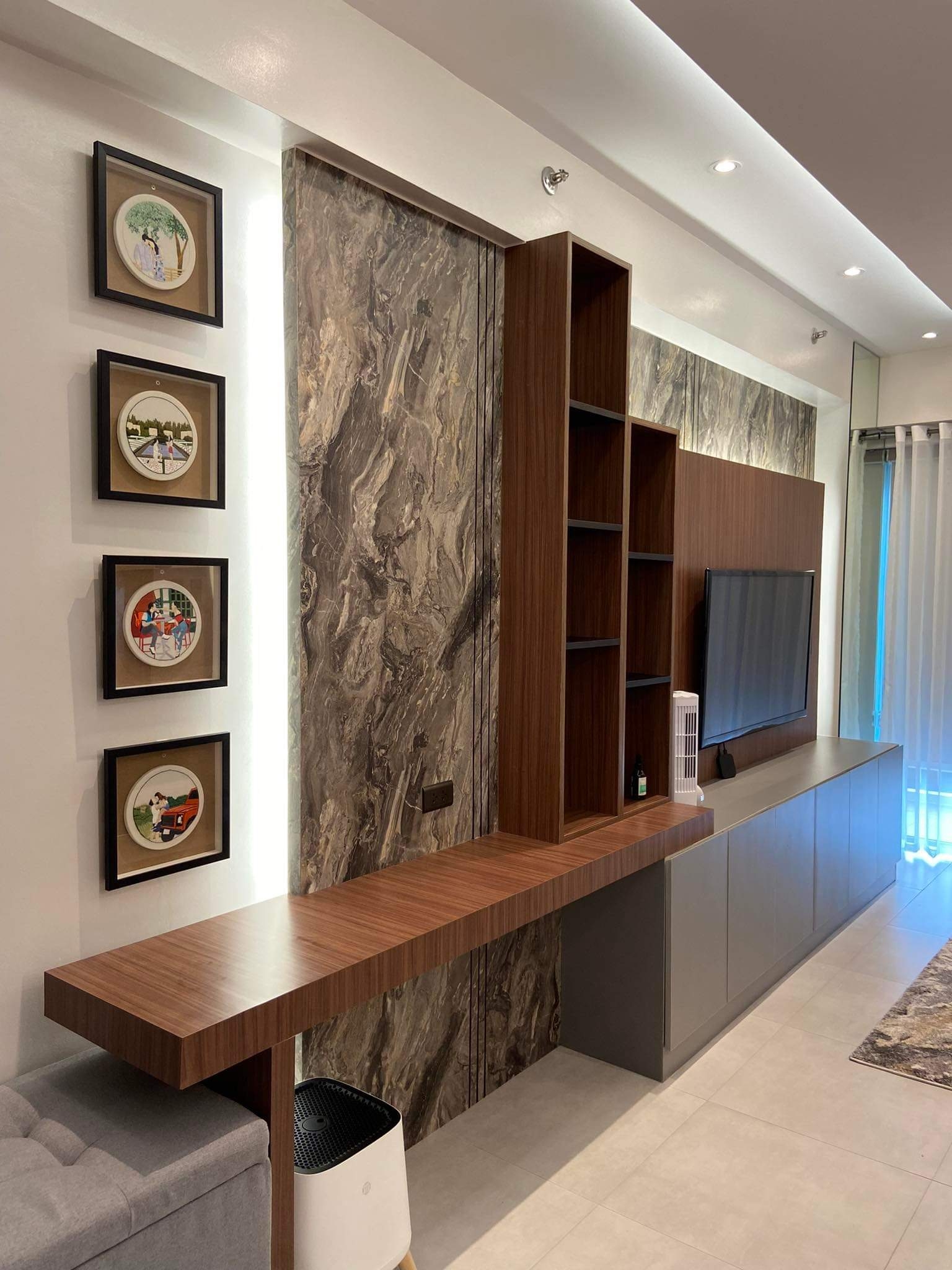 Living area furnished with an L-shaped sofa, area rug, wall-mounted TV, fitted shelves, artworks and split type air-conditioning