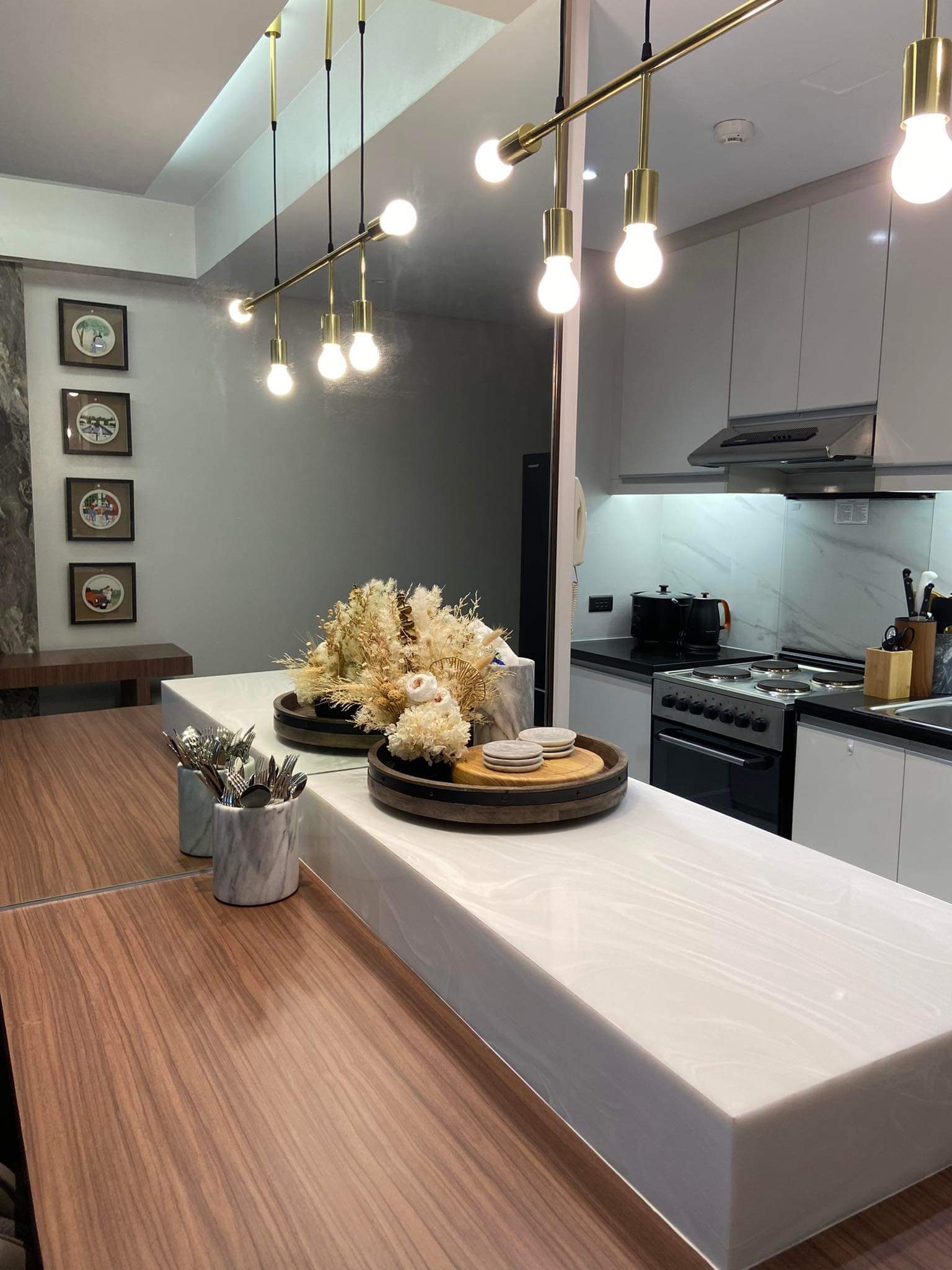 Open plan kitchen with breakfast counter is equipped with major appliances that includes refrigerator, electric stove, range hood, rice cooker and electric kettle