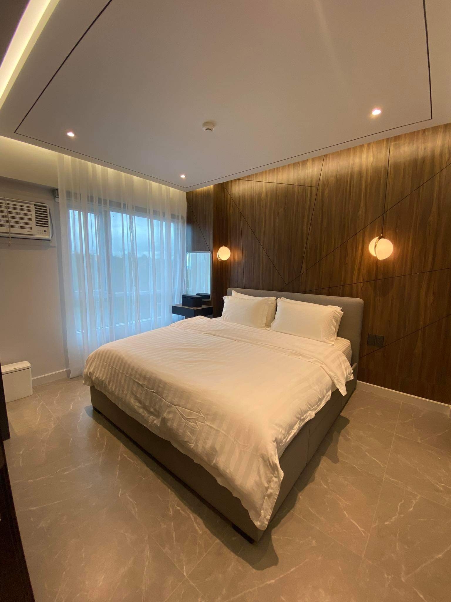 Bedroom furnished with a queen size bed, side table, modern lamps, fitted wardrobe, window type air-conditioning and en-suite shower room
