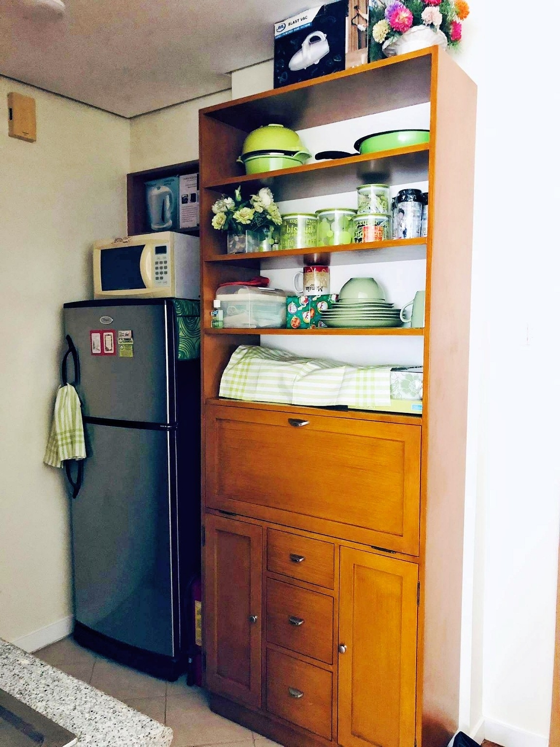 Open plan fitted kitchen is equipped with major appliances including microwave oven, electric stove, range hood and refrigerator