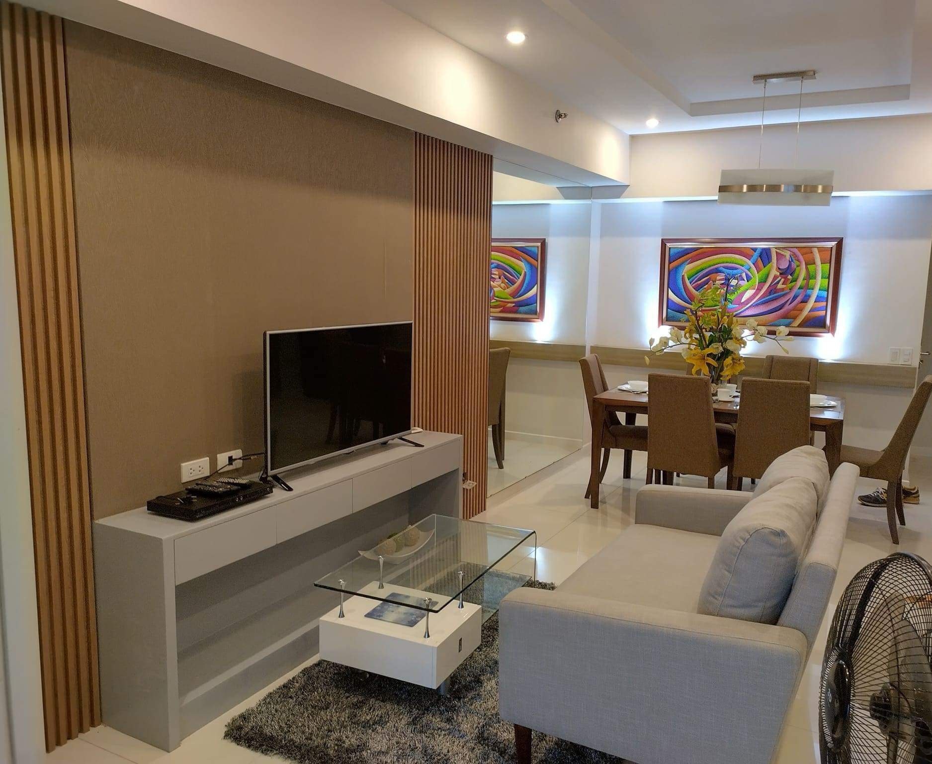 Living area has a sofa, area rug, glass top coffe table, flat-screen TV, TV rack and standing fan