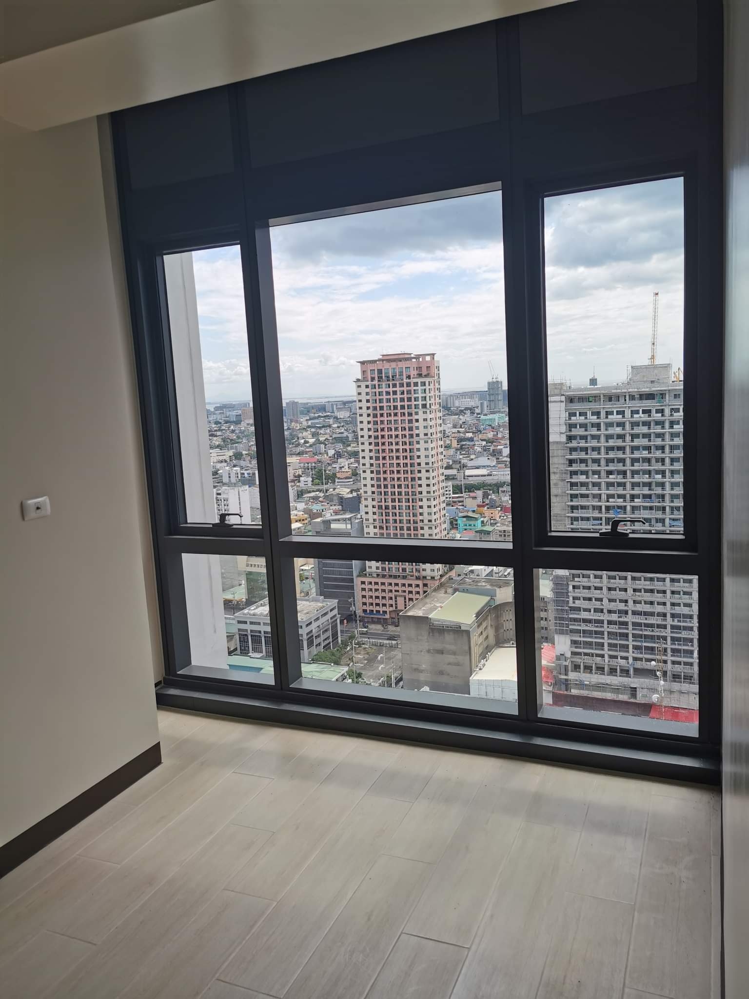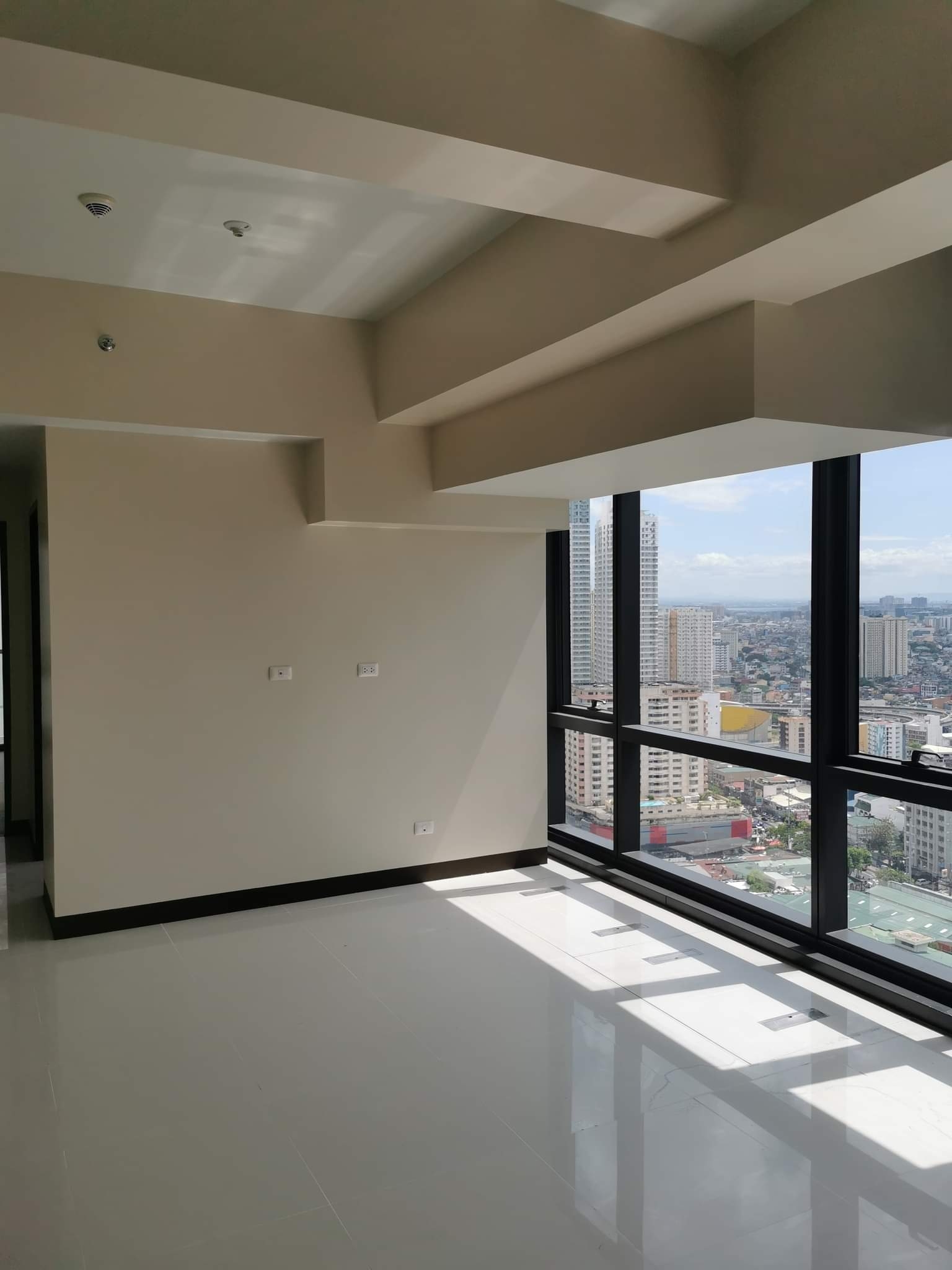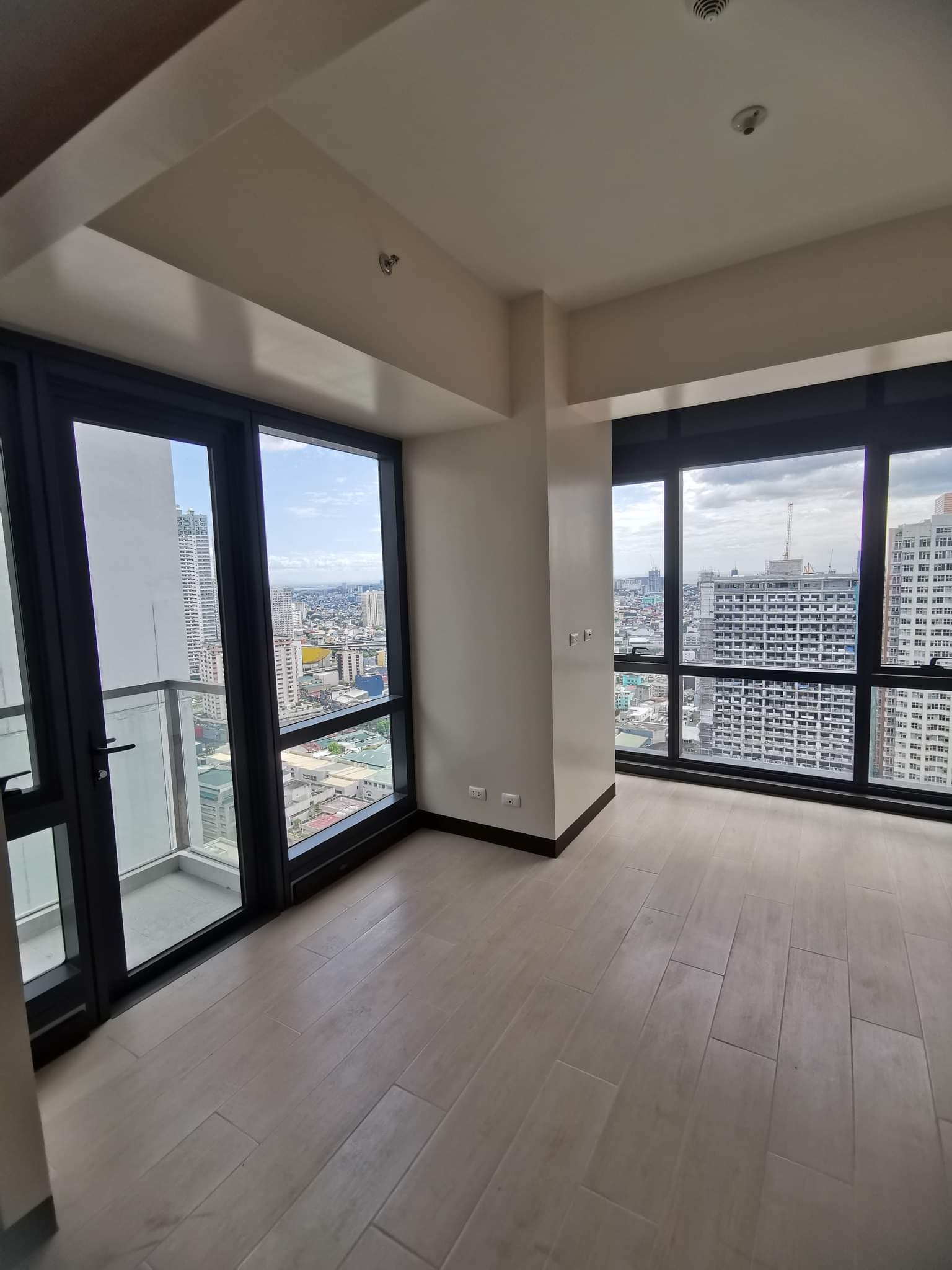 Bright living area han an access to the balcony with an overlooking view of the city skyline