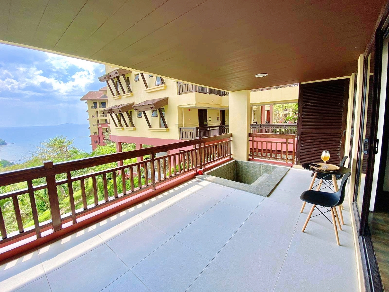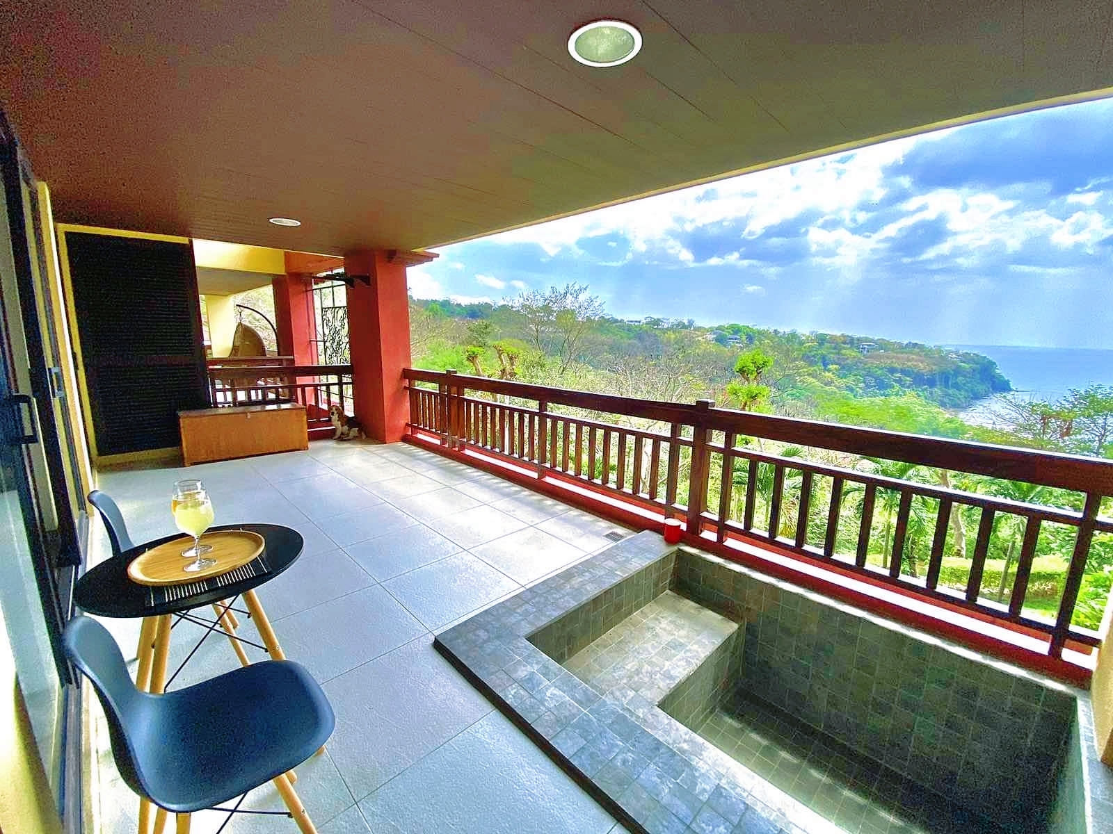 All rooms have access to the over-sized balcony which has a jacuzzi tub and views of the garden and the sea