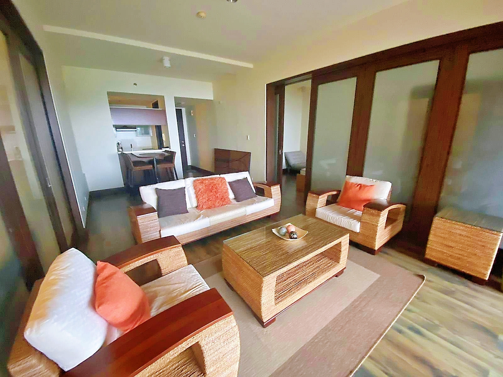 Floor to ceiling sliding doors make this a bright apartment throughout