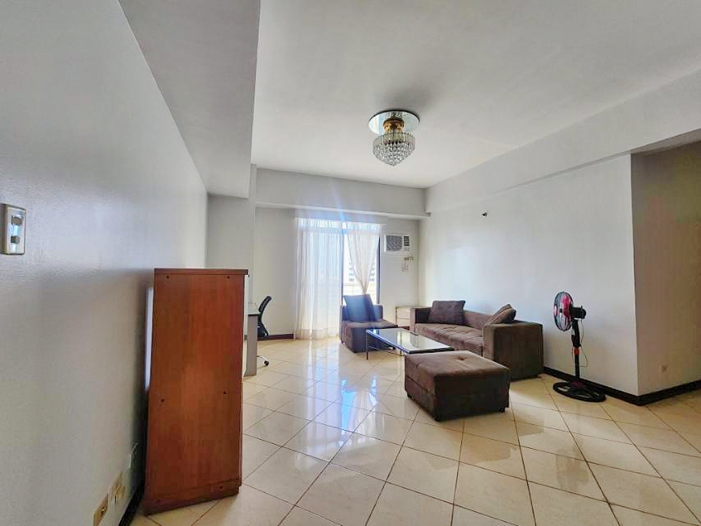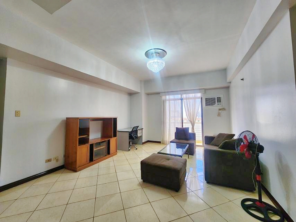 Spacious living area furnished with a sofa set, glass-top coffee table, TV rack with shelves, office table, swivel chair and has access to the balcony that offers amazing views of its city skyline