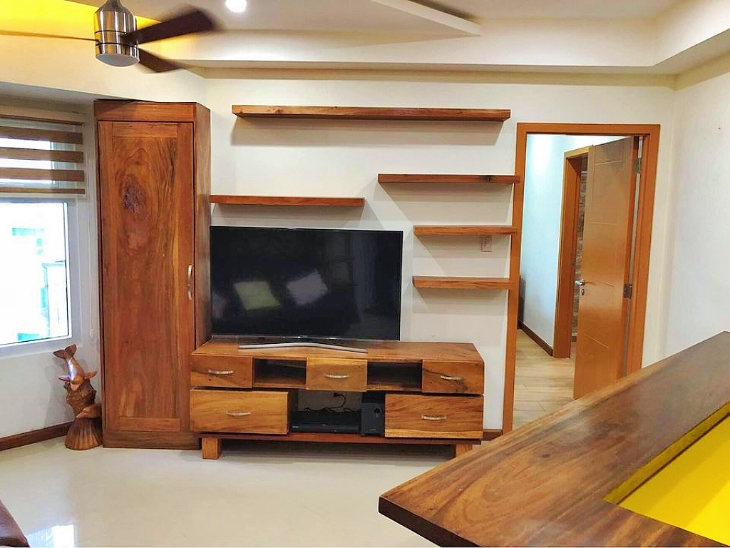 Living area is furnished with a brown couch, flat screen TV, wooden shelves and cabinets