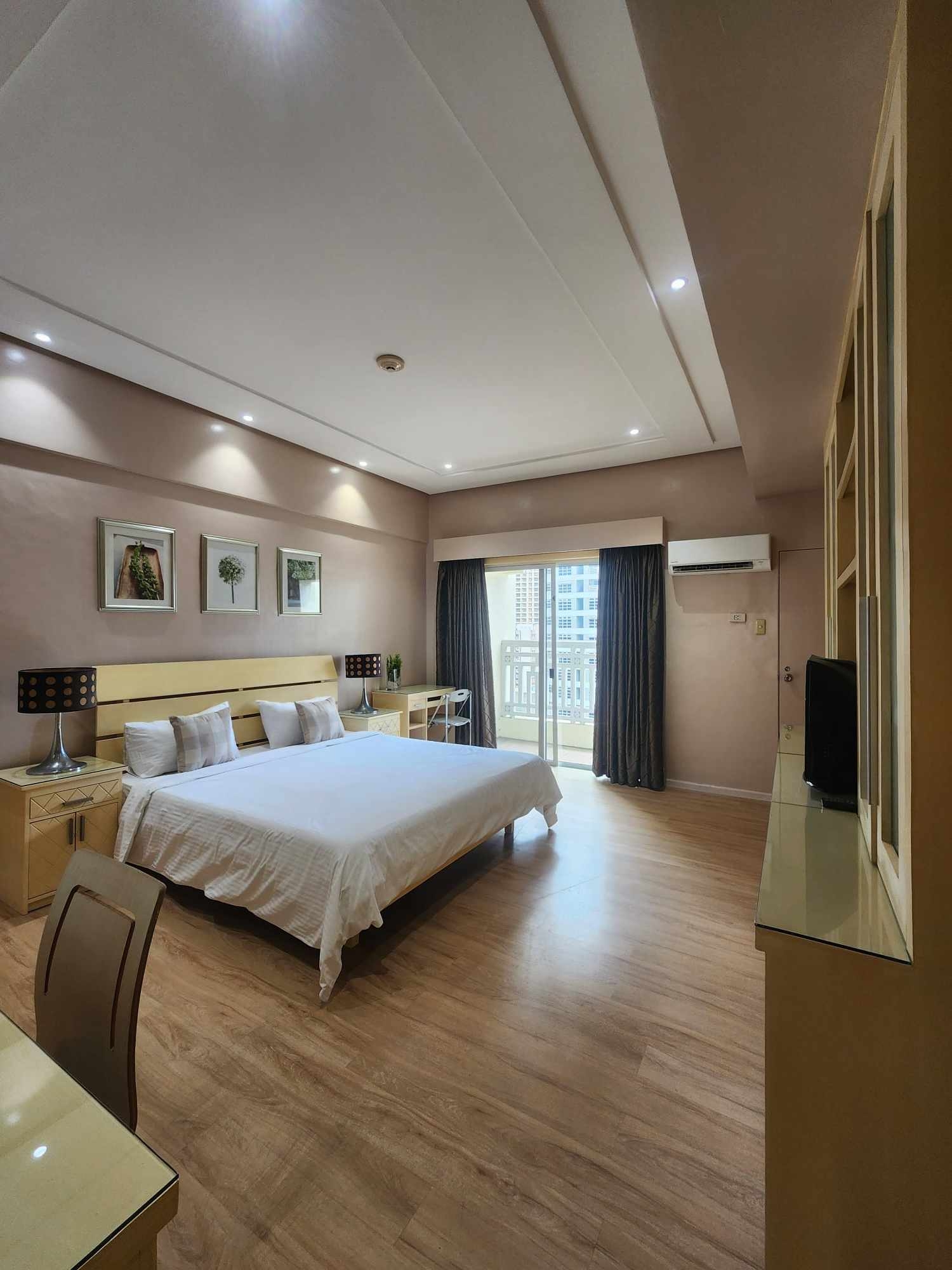Master bedroom is furnished with a king-size bed, side tables with drawers, lamps, a study table and split-type air-conditioning