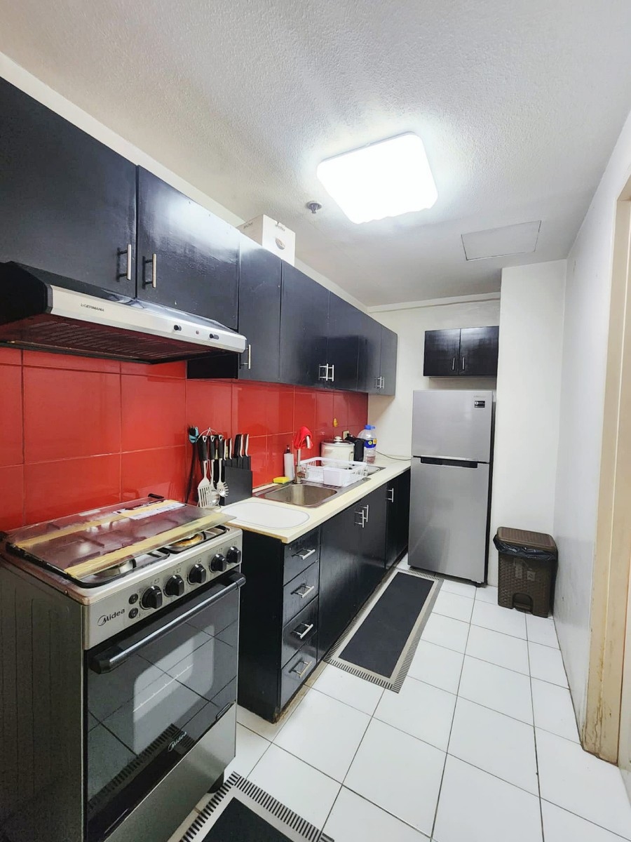 Further back from the dining area is the fitted kitchen area equipped with gas stove with range hood, microwave oven, cooker and fridge