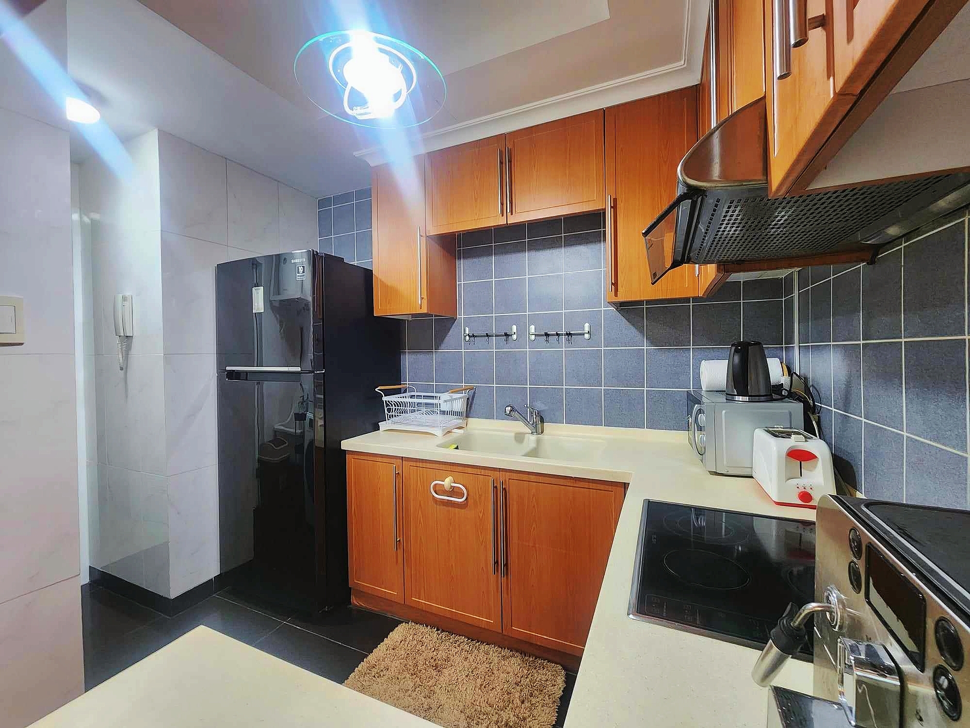 Kitchen has breakfast bar, fitted cabinets and equipped with major appliances including refrigerator, electric stove and range hood