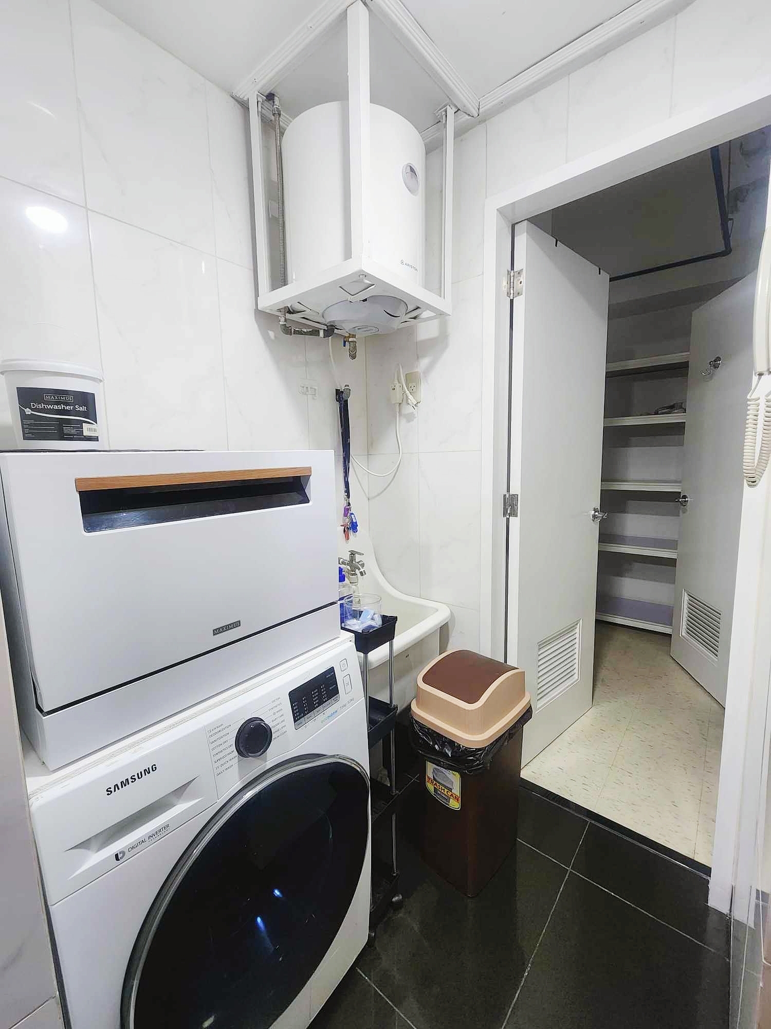 Utility/laundry area has Maximus tabletop dishwasher and Samsung front load washer dryer with digital inverter