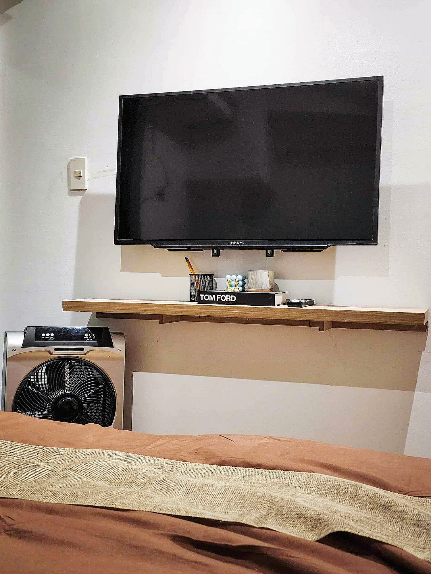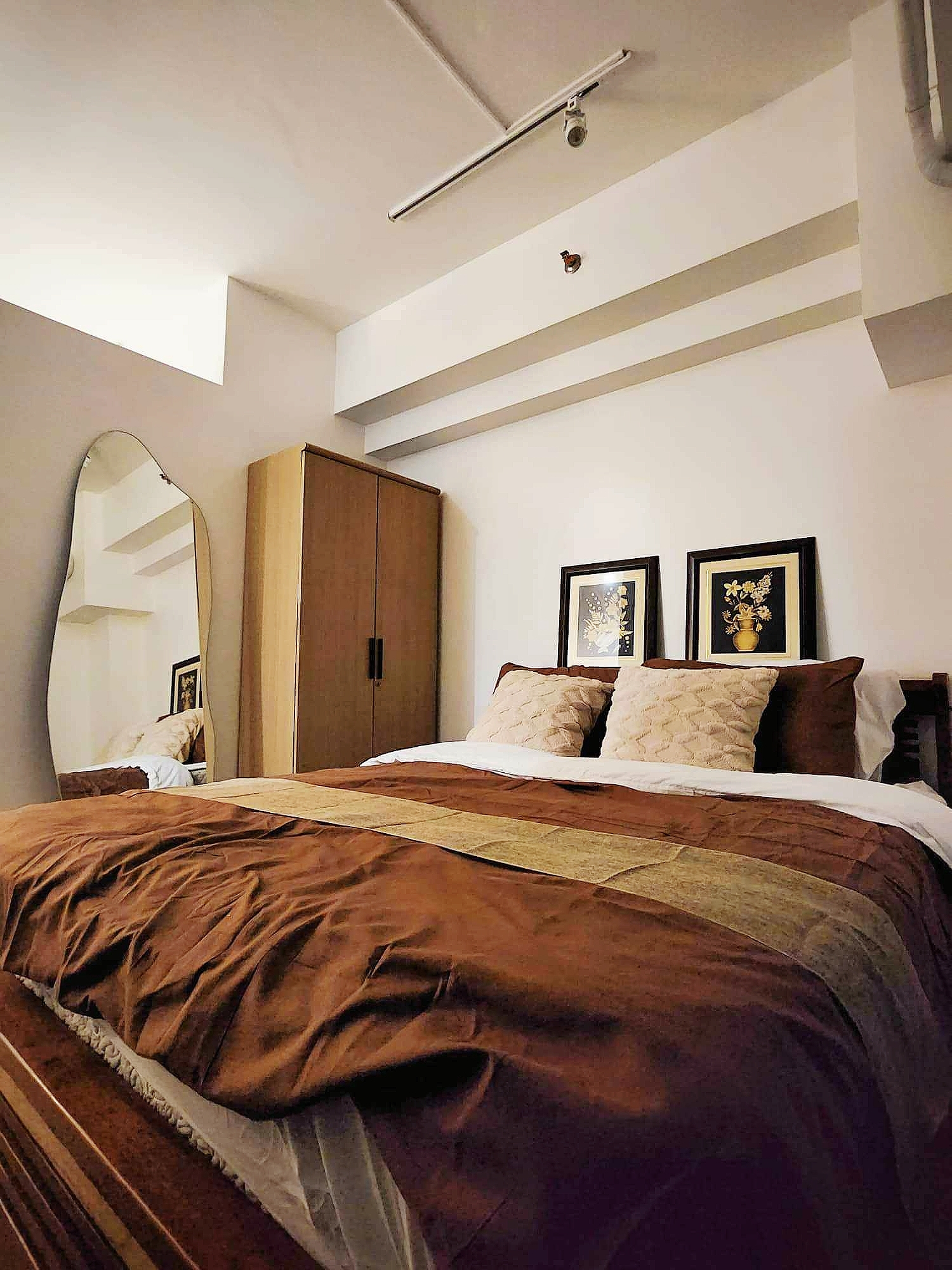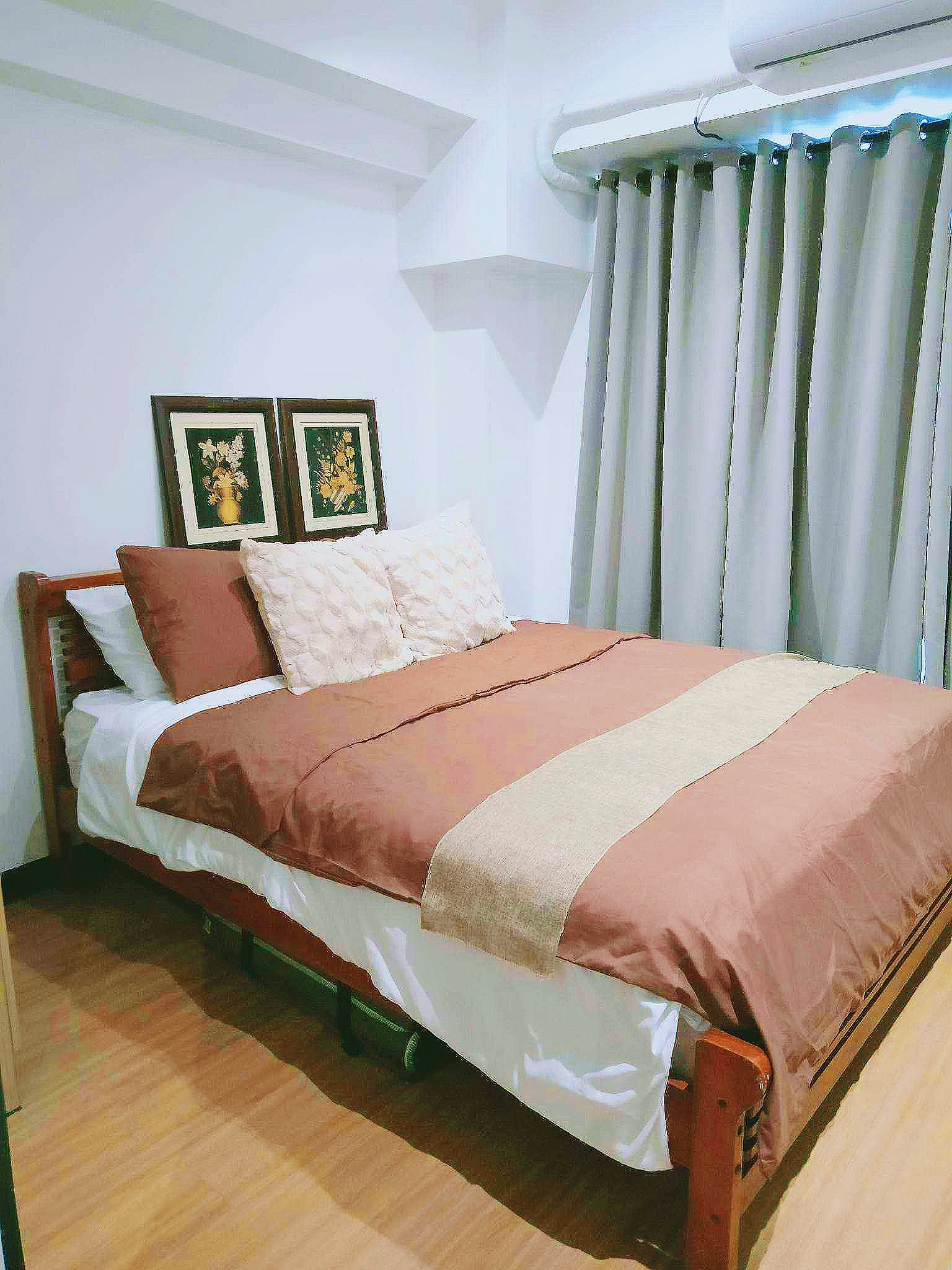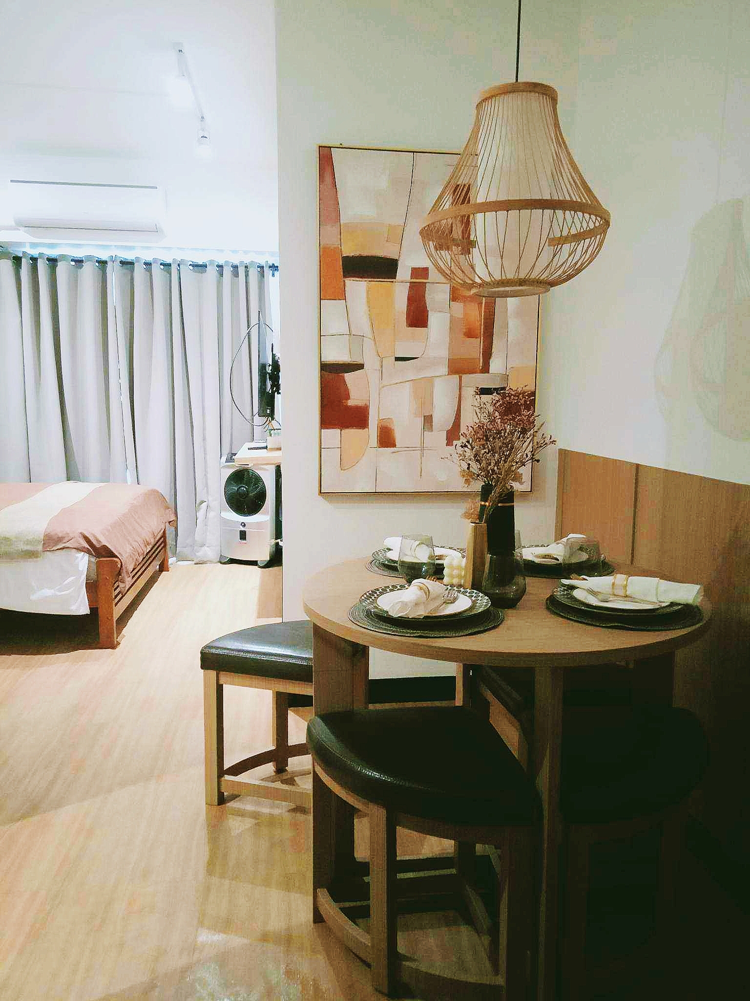 Complete with a queen size bed, wall-mounted flat-screen TV, shelves, full-length mirror, blackout curtains, cabinet, split type air-conditioning unit and the cozy dining area comfortably seats four