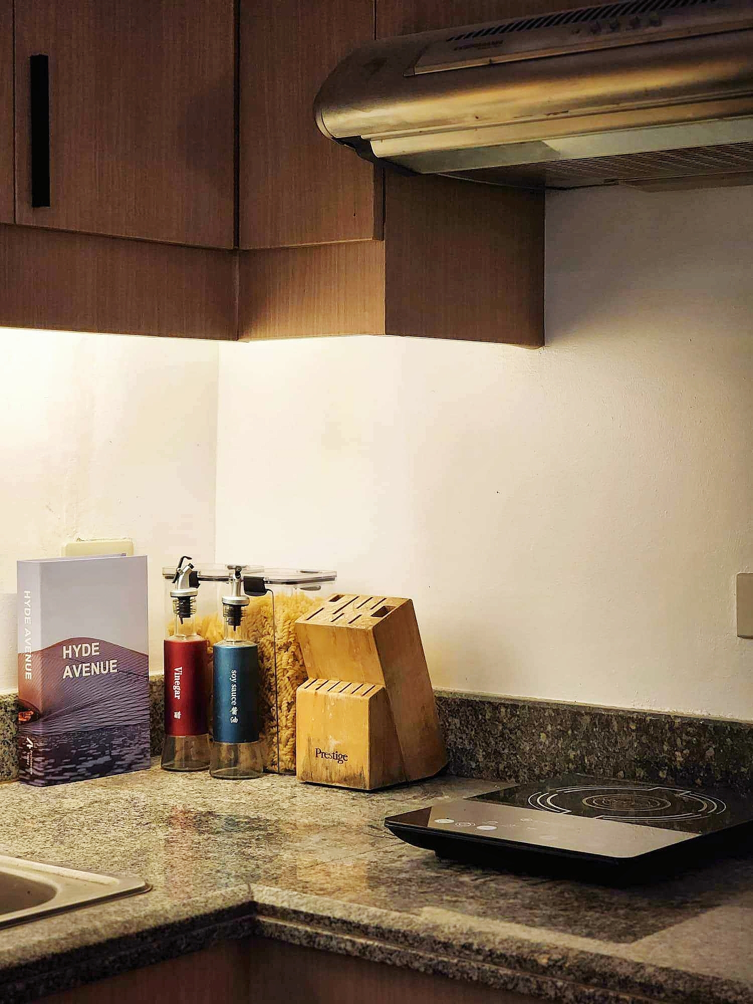 Open plan fitted kitchen is equipped with induction cooker, range hood, refrigerator and washer/dryer
