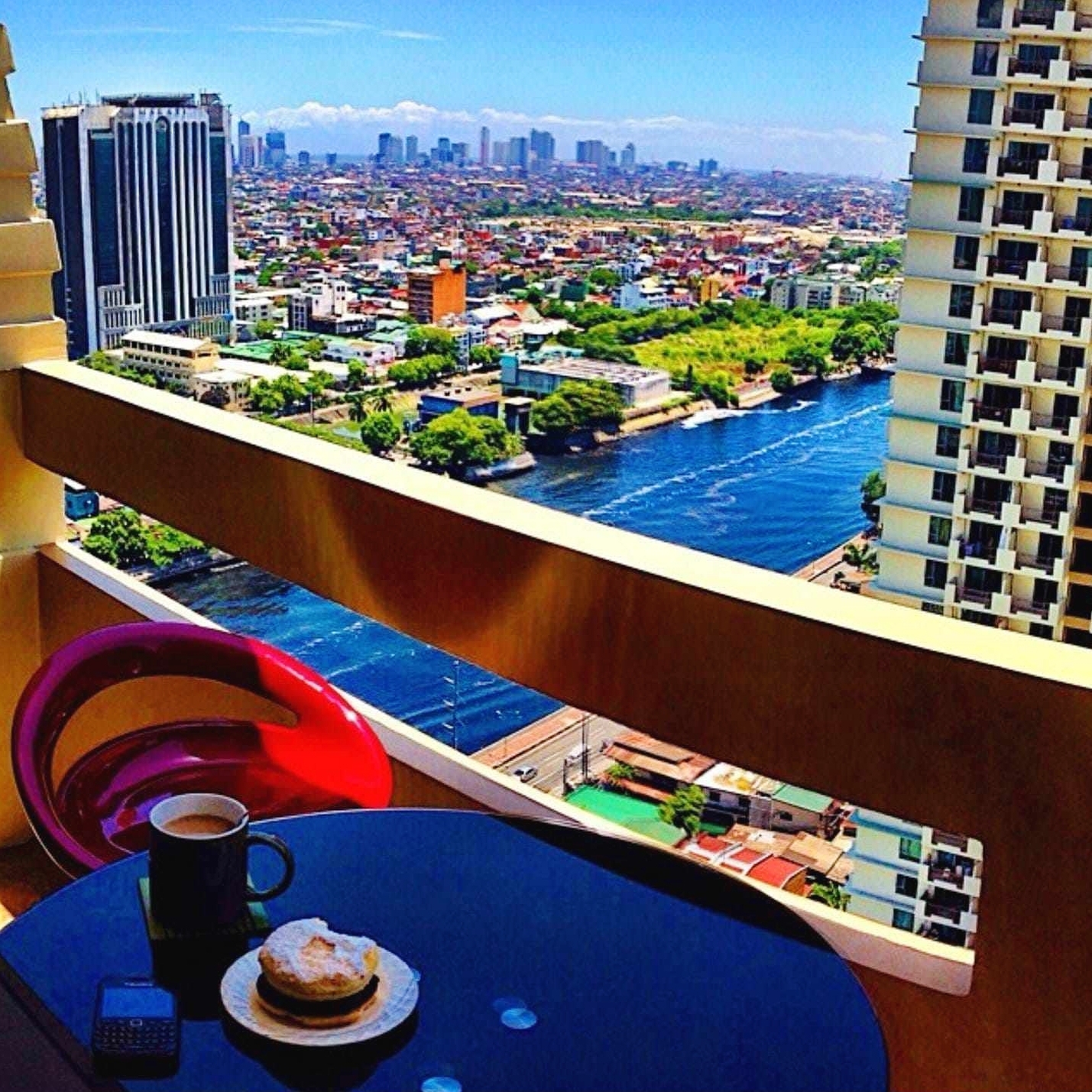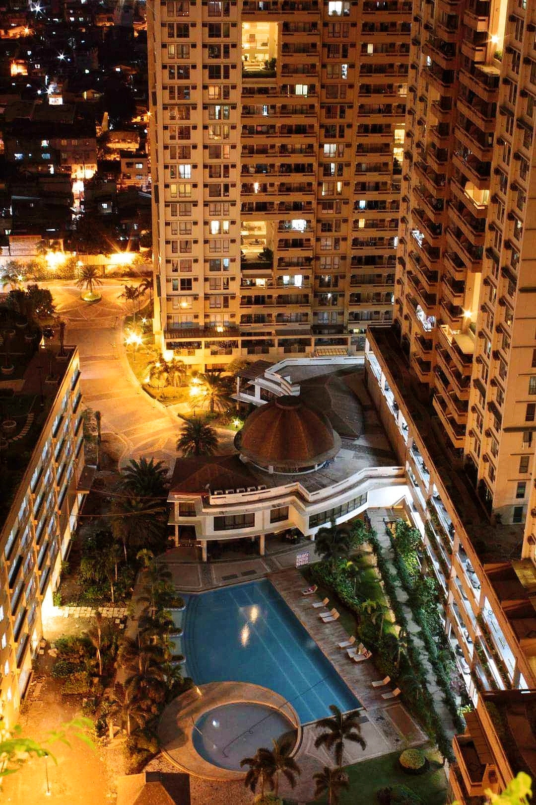 Balcony has an overlooking looking view of the amenities and city skyline