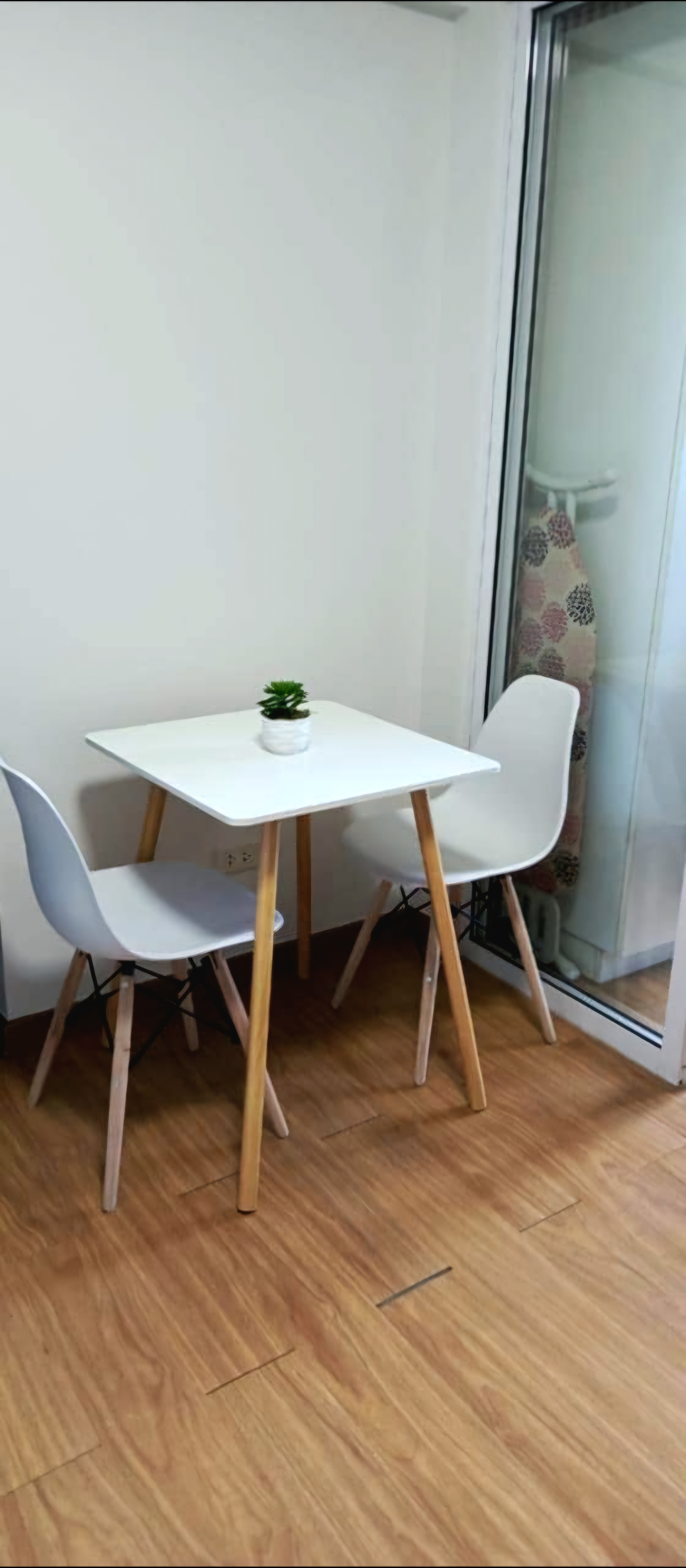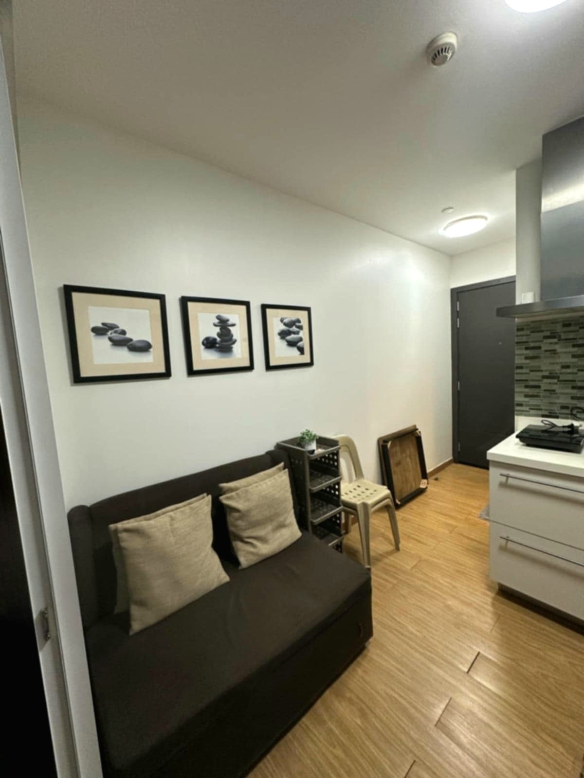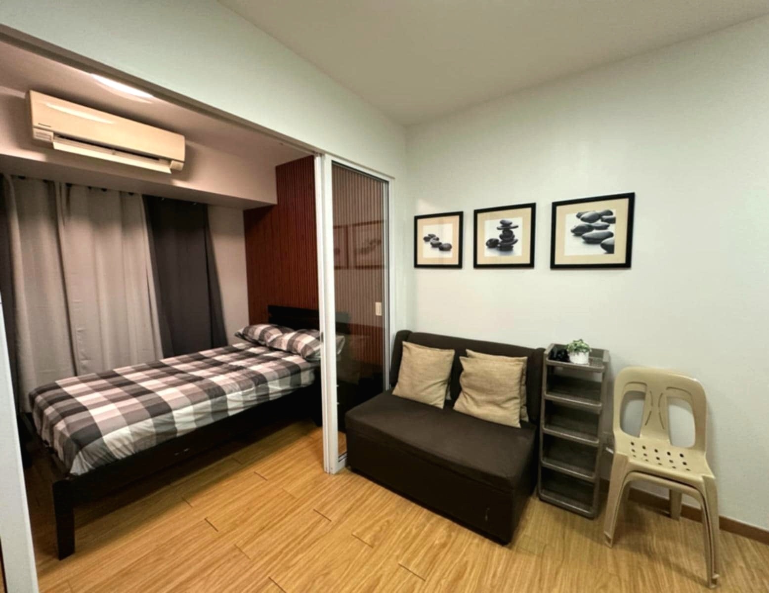 This unit covers over 27 square meters and comes fully-furnished with a glass partition to the bedroom