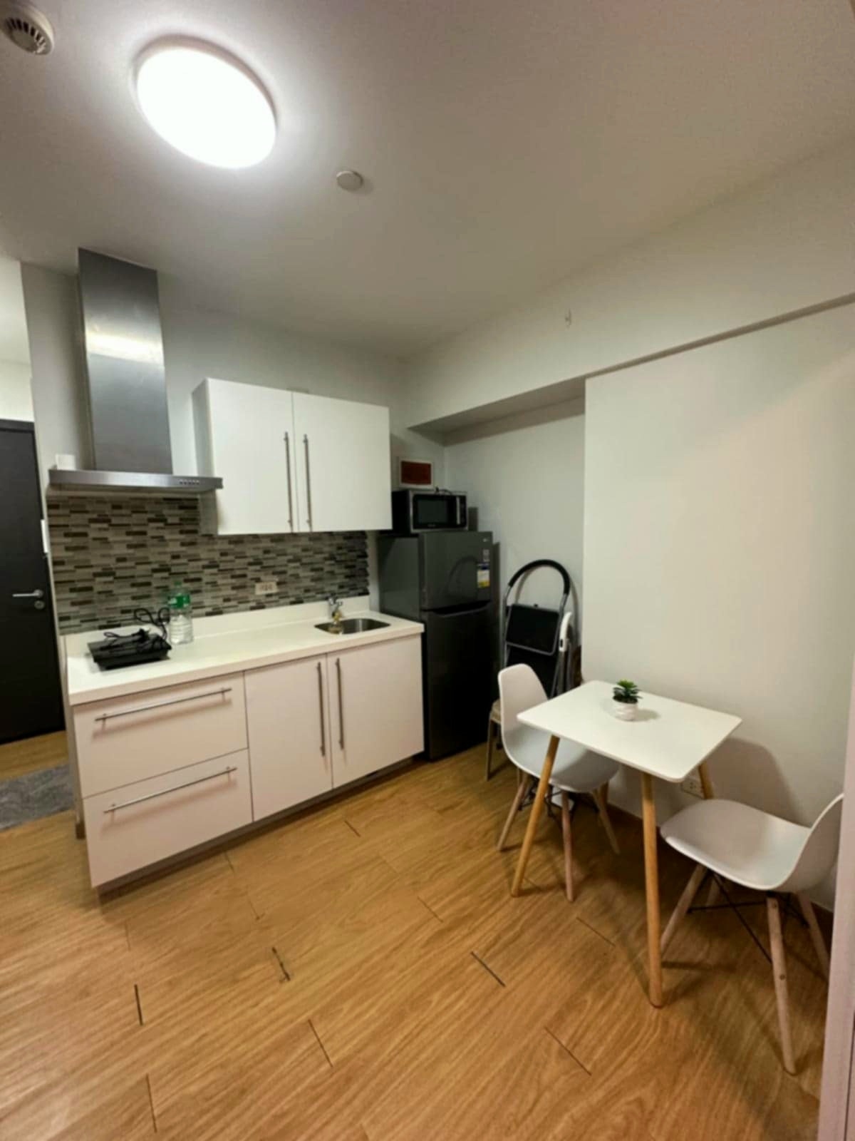 Open plan kitchen is equipped with an induction cooker, range hood, microwave and refrigerator