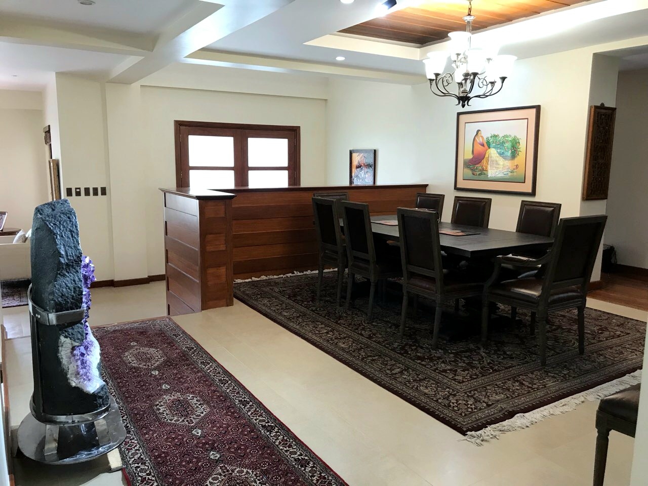 Elevated dining area with a chandelier and a large dining table that accommodates eight people