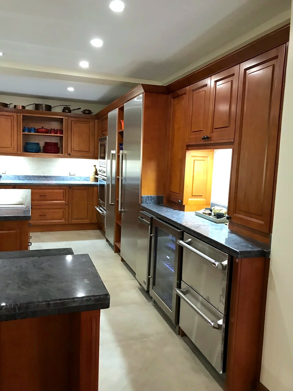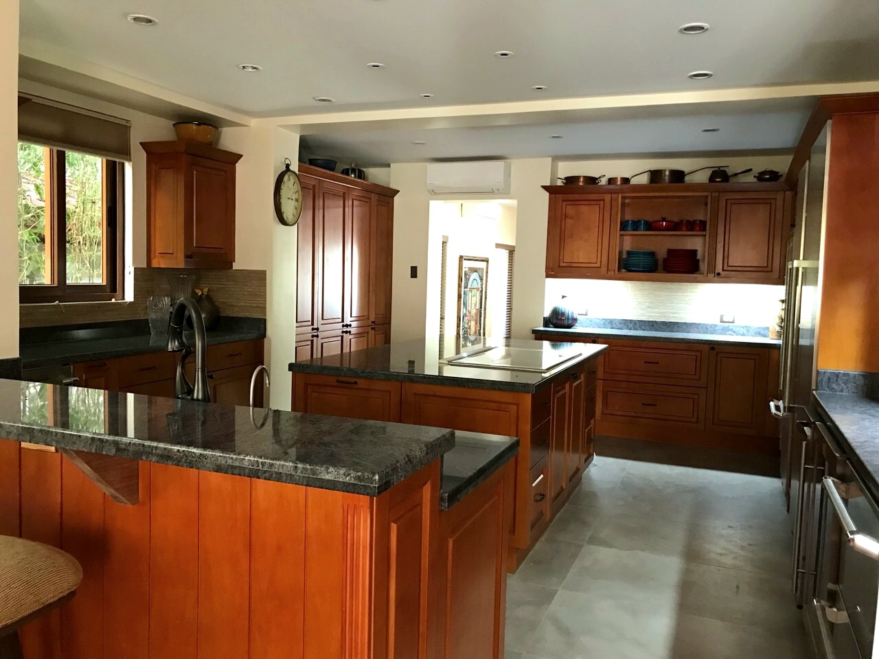 The modern and well-appointed kitchen is equipped with high-end appliances and has two sizable islands/workspaces dominating the space with granite countertops.