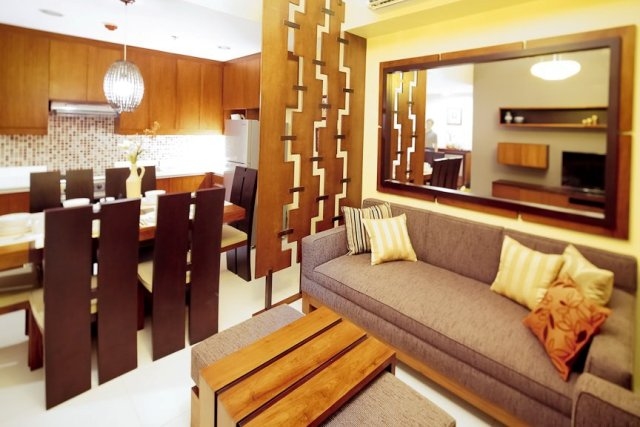 Living room has a 5-seater sofa made of narra and 42 inch Samsung TV with satellite decoder