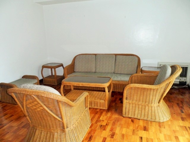 Bright, large living area has a rattan sofa set and adjoining dining area