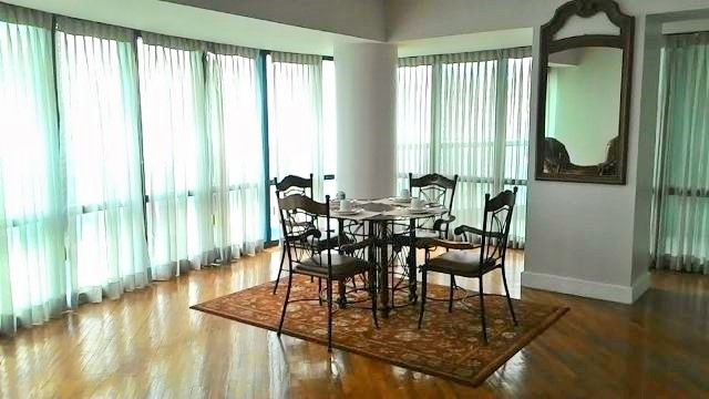 Adjacent to the living area is a glass topped dining table and the dining area prrovides access to the balcony with views of Edades Tower, Powerplant Mall and the Manila Skyline.