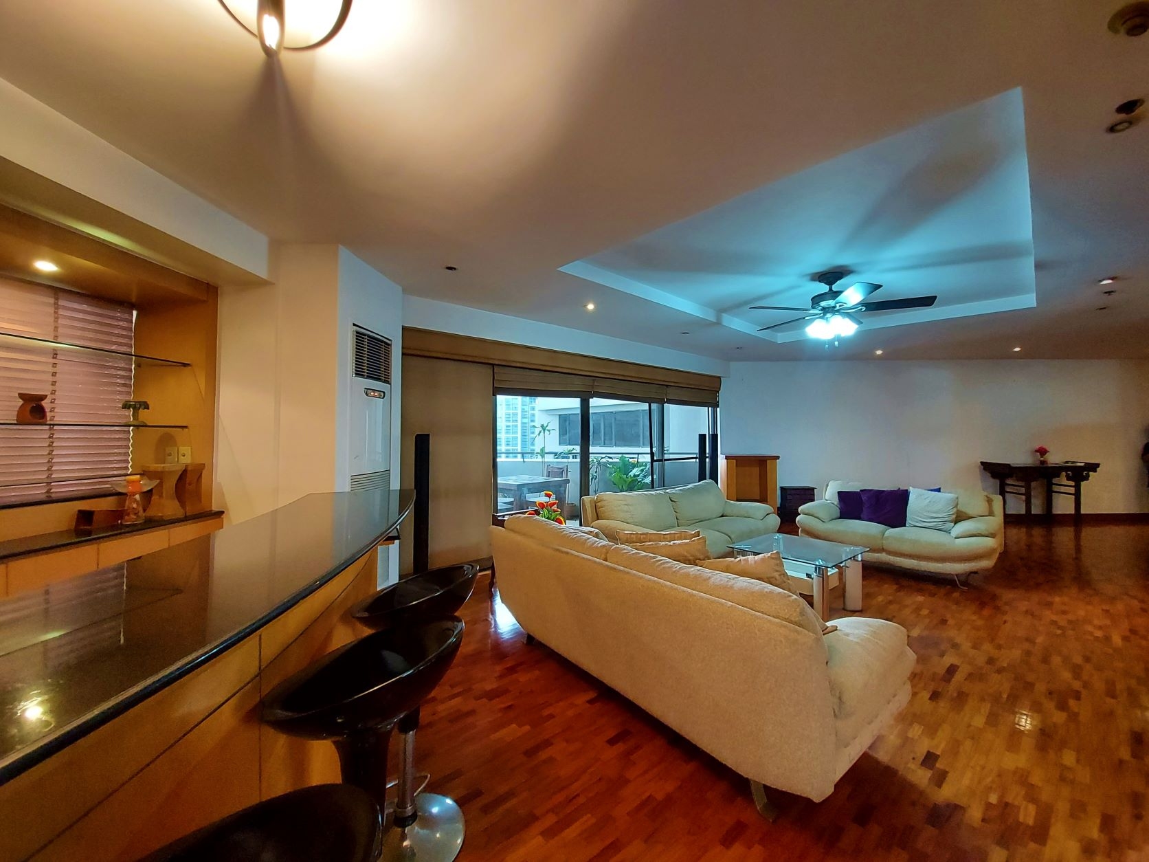 Spacious living room has a white sofa set, wooden center table, flat screen TV, area rug and bar in the corner with three stools
