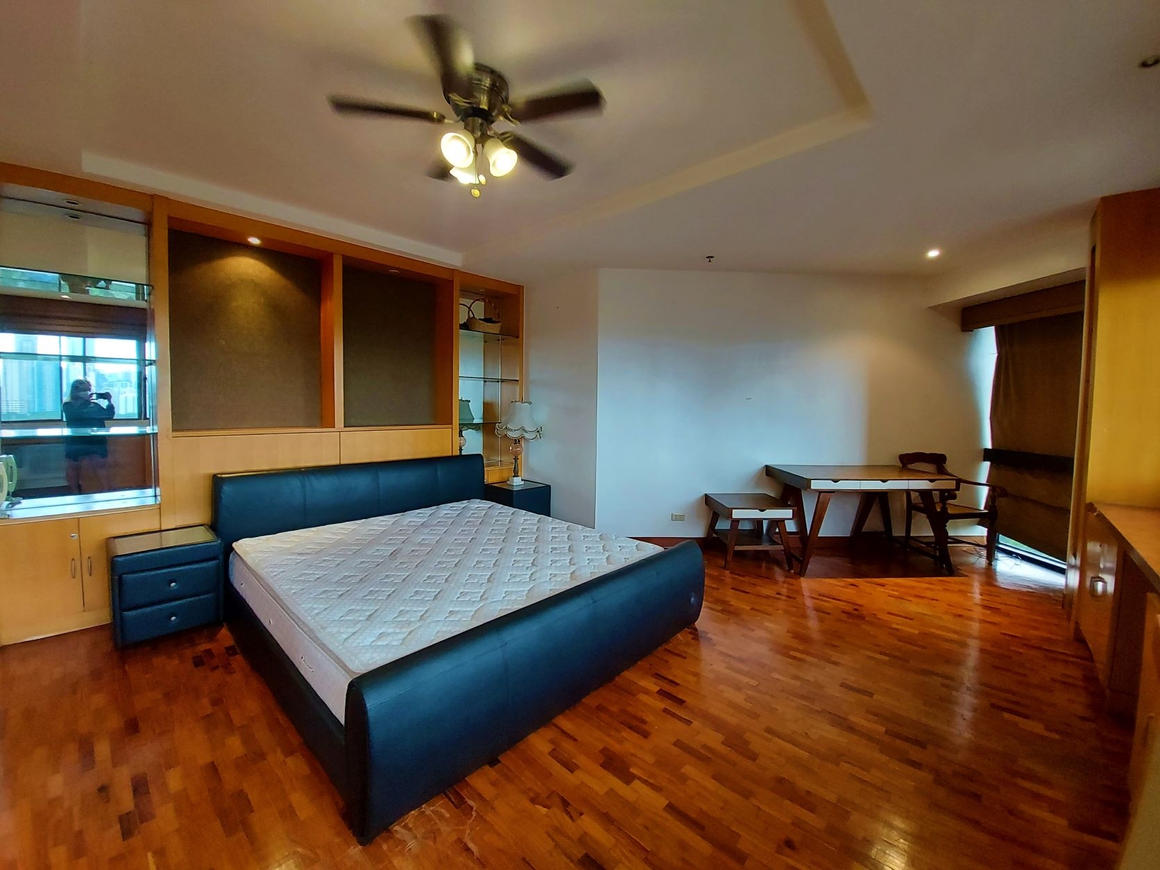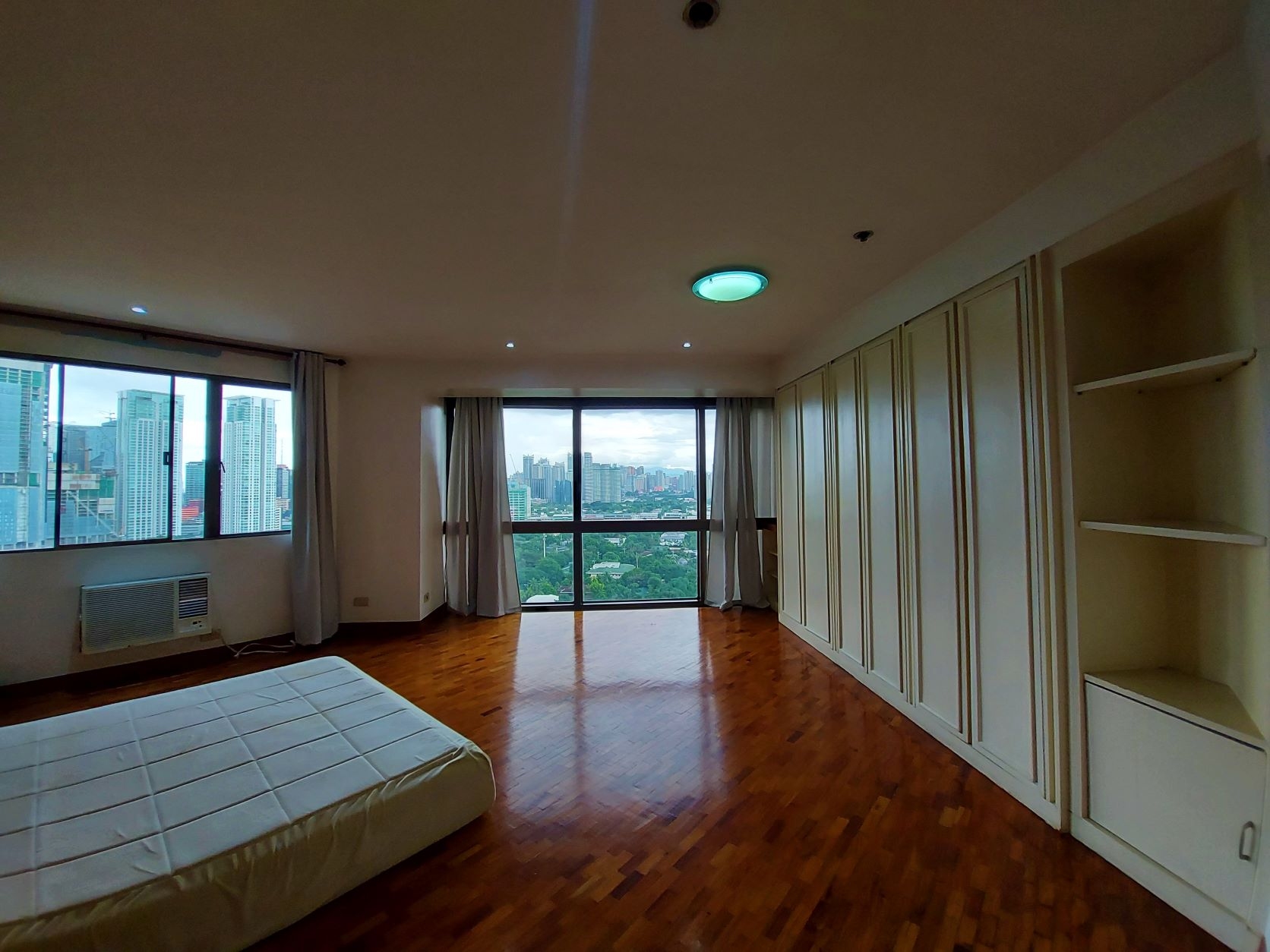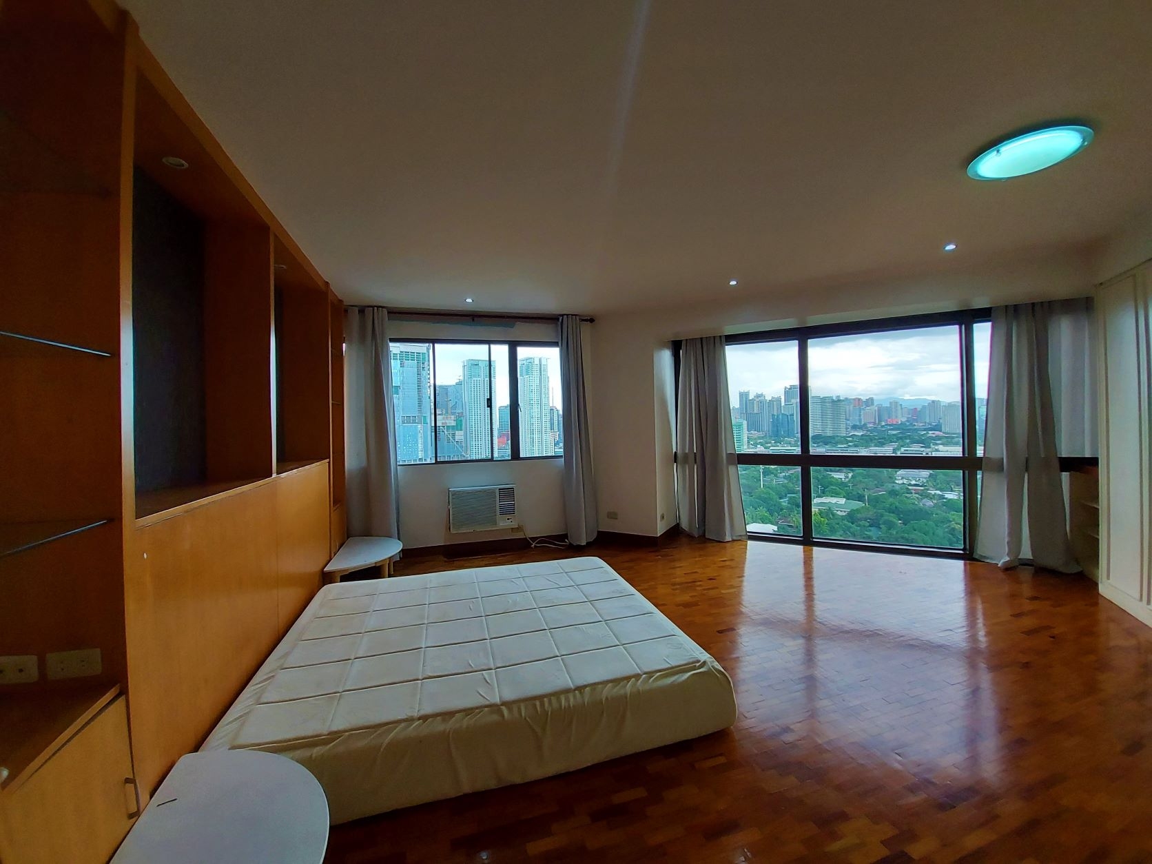 Master bedroom has a queen size bed, bedside table, fitted cabinets, walk in closet and panoramic views of Urdaneta Village